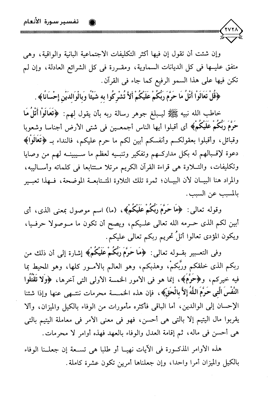 وفى التعبير بقوله تعابى: (مَا حَرَّمَ رَبُّكُمْ عَلَيْكُمْ) إشارة إلى أن ذلك من ربكم الذي خلقكم وربَّكمْ، وهذبكم، وهو العالم بالأمور كلها، وهو المحيط بما فيه خيركم، و (حرَّمَ)، إنما هو في الأمور الخمسة الأولى التي آخرها، (وَلا تَقْتُلُوا النَّفْسَ الَّتِي حَرَّمَ اللَّهُ إِلَّا بِالْحَقِّ)، فإن هذه الخمسة محرمات ننتهي عنها وإذا شئنا الإحسان إلى الوالدين، أما الباقي فأكثره مأمورات من الوفاء بالكيل والميزان، وألا يقربوا مال اليتيم إلا بالتي هي أحسن، فهو في معنى الأمر في معاملة اليتيم بالتي هي أحسن في ماله، ثم إقامة العدل والوفاء بالعهد فهذه أوامر لَا محرمات.