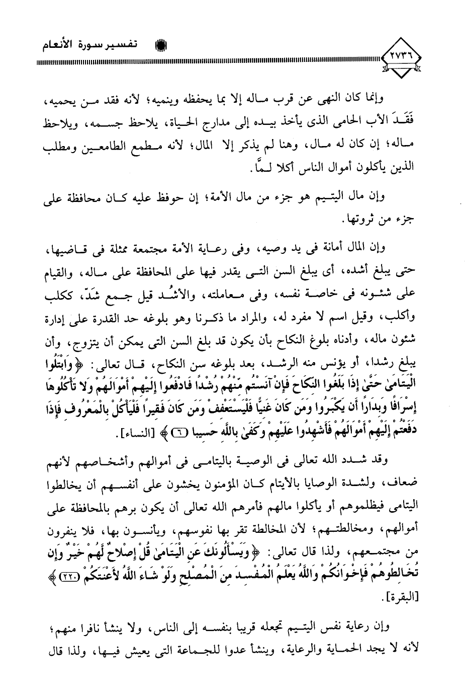 وإن المال أمانة في يد وصيه، وفي رعاية الأمة مجتمعة ممثلة في قاضيها، حتى يبلغ أشده، أي يبلغ السن التي يقدر فيها على المحافظة على ماله، والقيام على شئونه في خاصة نفسه، وفي معاملته، والأشُد قيل جمع شَدّ، ككلب وأكلب، وقيل اسم لَا مفرد له، والمراد ما ذكرنا وهو بلوغه حد القدرة على إدارة شئون ماله، وأدناه بلوغ النكاح بأن يكون قد بلغ السن التي يمكن أن يتزوج، وأن يبلغ رشدا، أو يؤنس منه الرشد، بعد بلوغه سن النكاح، قال تعالى: (وَابْتَلُوا الْيَتَامَى حَتَّى إِذَا بَلَغُوا النِّكَاحَ فَإِنْ آنَسْتُمْ مِنْهُمْ رُشْدًا فَادْفَعُوا إِلَيْهِمْ أَمْوَالَهُمْ وَلَا تَأْكُلُوهَا إِسْرَافًا وَبِدَارًا أَنْ يَكْبَرُوا وَمَنْ كَانَ غَنِيًّا فَلْيَسْتَعْفِفْ وَمَنْ كَانَ فَقِيرًا فَلْيَأْكُلْ بِالْمَعْرُوفِ فَإِذَا دَفَعْتُمْ إِلَيْهِمْ أَمْوَالَهُمْ فَأَشْهِدُوا عَلَيْهِمْ وَكَفَى بِاللَّهِ حَسِيبًا (6).