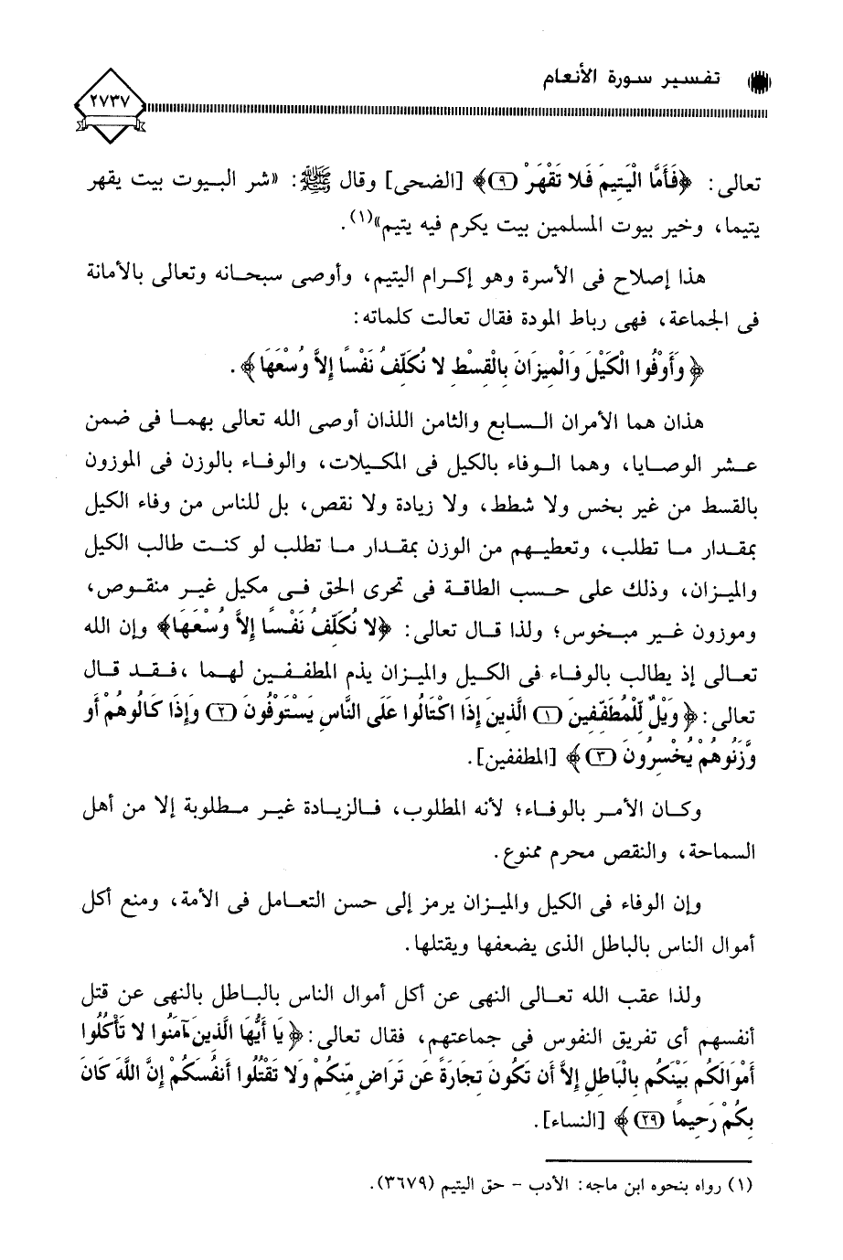 هذا إصلاح في الأسرة وهو إكرام اليتيم، وأوصى سبحانه وتعالى بالأمانة في الجماعة، فهي رباط المودة فقال تعالت كلماته: