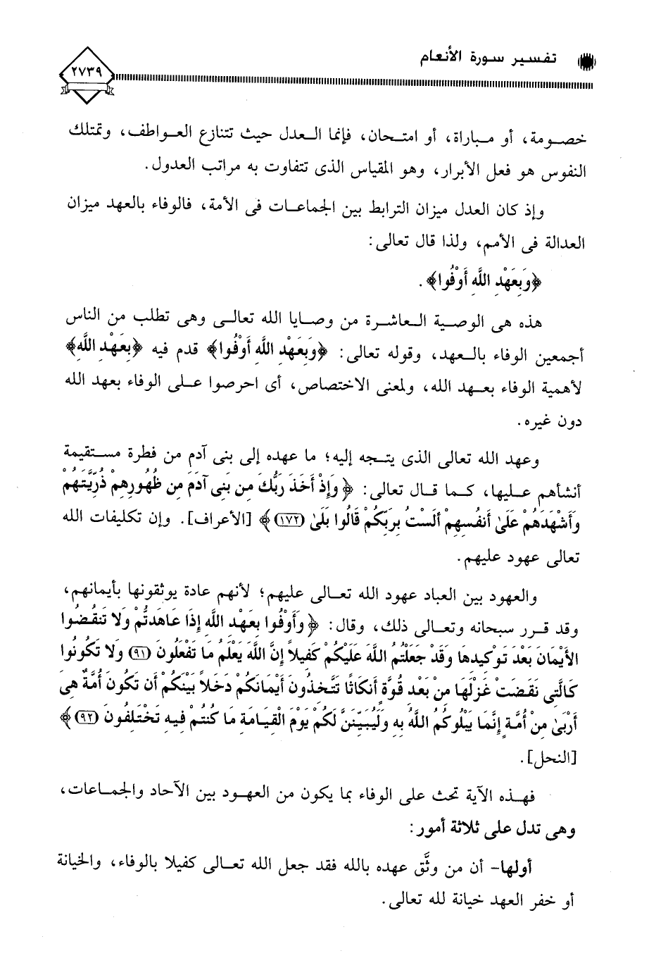 هذه هي الوصية العاشرة من وصايا الله تعالى وهي تطلب من الناس أجمعين الوفاء بالعهد، وقوله تعالى: (وَبِعَهْدِ اللَّهِ أَوْفُوا) قدم فيه (بِعَهْدِ اللَّهِ) لأهمية الوفاء بعهد الله، ولمعنى الاختصاص، أي احرصوا على الوفاء بعهد الله دون غيره.