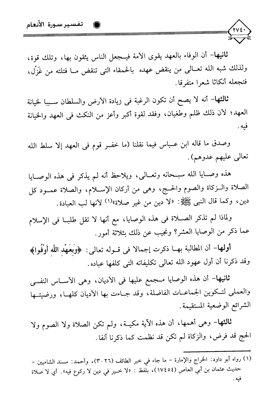 ثالثها - أنه لَا يصح أن تكون الرغبة في زيادة الأرض والسلطان سببا لخيانة العهد؛ لأن ذلك ظلم وطغيان، وفقد لقوة أكبر وأعز من النكث في العهد والخيانة وصدق ما قاله ابن عباس فيما نقلنا (ما خفر قوم في العهد إلا سلط الله تعالى عليهم عدوهم).