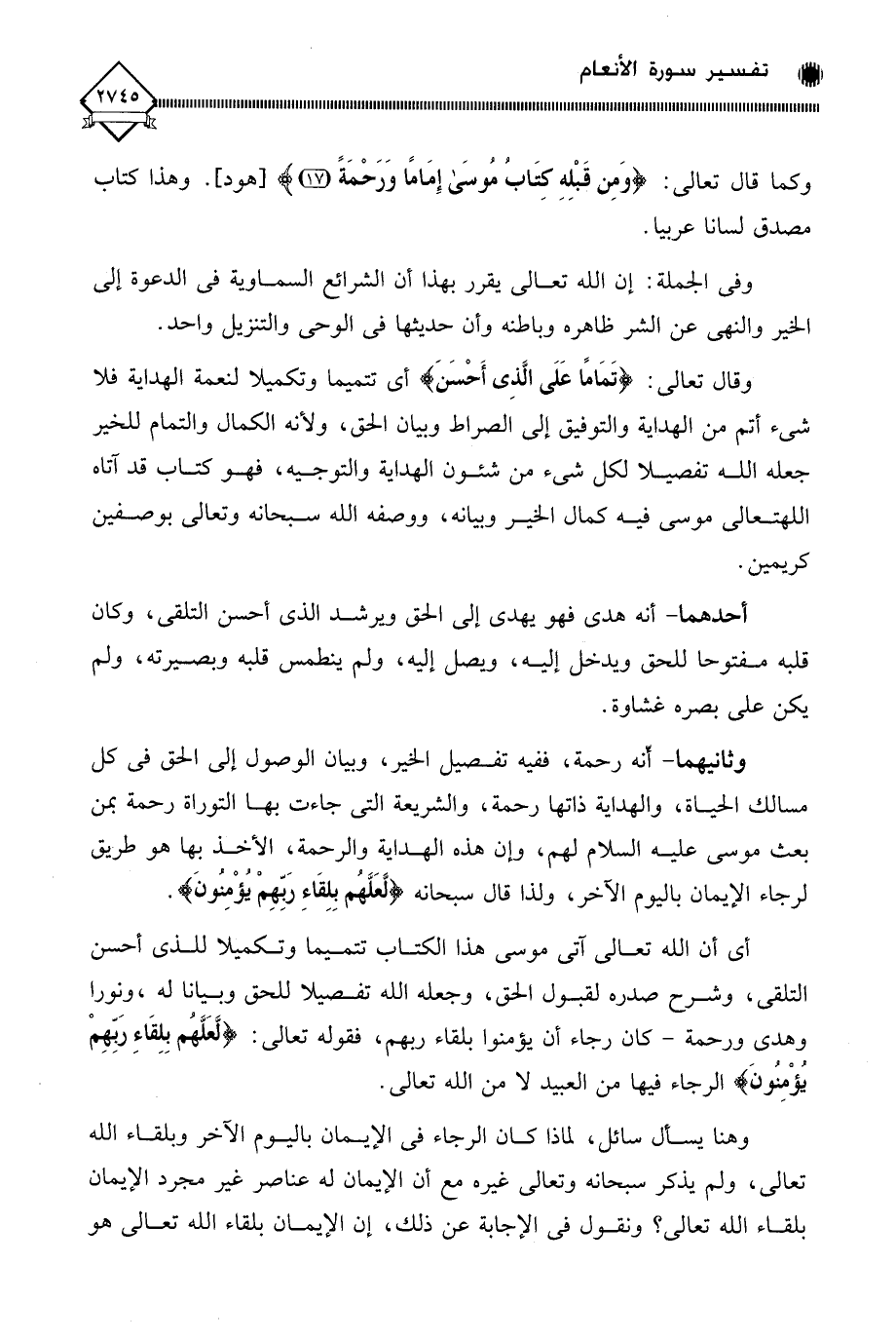 أي أن الله تعالى آتي موسى هذا الكتاب تتميما وتكميلا للذي أحسن التلقي، وشرح صدره لقبول الحق، وجعله الله تفصيلا للحق وبيانا له، ونورا وهدى ورحمة - كان رجاء أن يؤمنوا بلقاء ربهم، فقوله تعالى: (لَّعَلَّهُم بِلِقَاءِ رَبِّهِمْ يُؤْمِنُونَ) الرجاء فيها من العبيد لَا من الله تعالى.