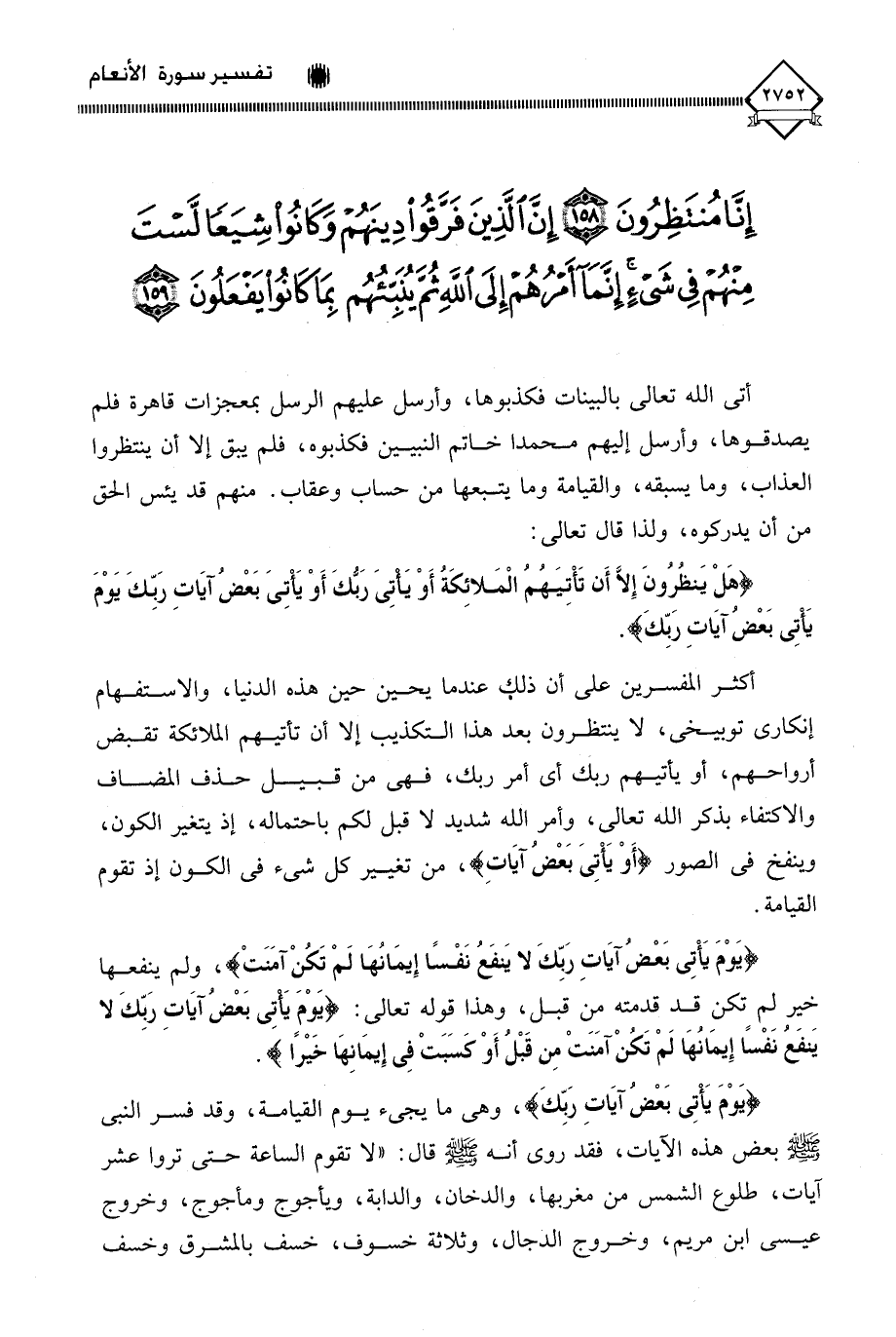 إِنَّا مُنْتَظِرُونَ (158) إِنَّ الَّذِينَ فَرَّقُوا دِينَهُمْ وَكَانُوا شِيَعًا لَسْتَ مِنْهُمْ فِي شَيْءٍ إِنَّمَا أَمْرُهُمْ إِلَى اللَّهِ ثُمَّ يُنَبِّئُهُمْ بِمَا كَانُوا يَفْعَلُونَ (159)