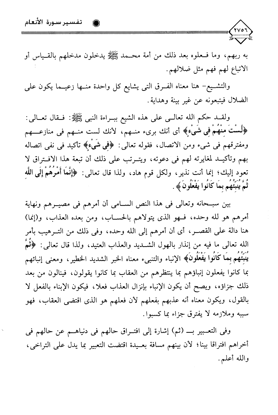ولقد حكم الله تعالى على هذه الشيع ببراءة النبي - صلى الله عليه وسلم -: فقال تعالى: (لَسْتَ مِنْهُمْ فِى شيءٍ) أي أنك بريء منهم، لأنك لست منهم في منازعهم ومفترقهم في شيء ومن الاتصال، فقوله تعالى: (فِى شَىْءٍ) تأكيد في نفي اتصاله بهم وتأكيد لمغايرته لهم في دعوته، ويترتب على ذلك أن تبعة هذا الافتراق لا تعود إليك؛ إنما أنت نذير، ولكل قوم هاد، ولذا قال تعالى: (إِنَّمَا أَمْرُهُمْ إِلَى اللَّه ثُمَّ يُنَبِّئُهُم بِمَا كَانُوا يَفْعَلُونَ).