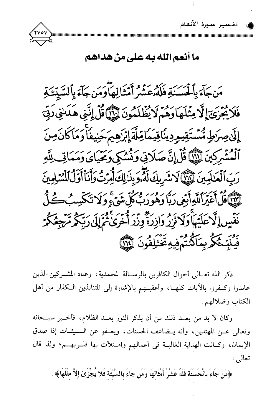 (مَنْ جَاءَ بِالْحَسَنَةِ فَلَهُ عَشْرُ أَمْثَالِهَا وَمَنْ جَاءَ بِالسَّيِّئَةِ فَلَا يُجْزَى إِلَّا مِثْلَهَا وَهُمْ لَا يُظْلَمُونَ (160) قُلْ إِنَّنِي هَدَانِي رَبِّي إِلَى صِرَاطٍ مُسْتَقِيمٍ دِينًا قِيَمًا مِلَّةَ إِبْرَاهِيمَ حَنِيفًا وَمَا كَانَ مِنَ الْمُشْرِكِينَ (161) قُلْ إِنَّ صَلَاتِي وَنُسُكِي وَمَحْيَايَ وَمَمَاتِي لِلَّهِ رَبِّ الْعَالَمِينَ (162) لَا شَرِيكَ لَهُ وَبِذَلِكَ أُمِرْتُ وَأَنَا أَوَّلُ الْمُسْلِمِينَ (163) قُلْ أَغَيْرَ اللَّهِ أَبْغِي رَبًّا وَهُوَ رَبُّ كُلِّ شَيْءٍ وَلَا تَكْسِبُ كُلُّ نَفْسٍ إِلَّا عَلَيْهَا وَلَا تَزِرُ وَازِرَةٌ وِزْرَ أُخْرَى ثُمَّ إِلَى رَبِّكُمْ مَرْجِعُكُمْ فَيُنَبِّئُكُمْ بِمَا كُنْتُمْ فِيهِ تَخْتَلِفُونَ (164)