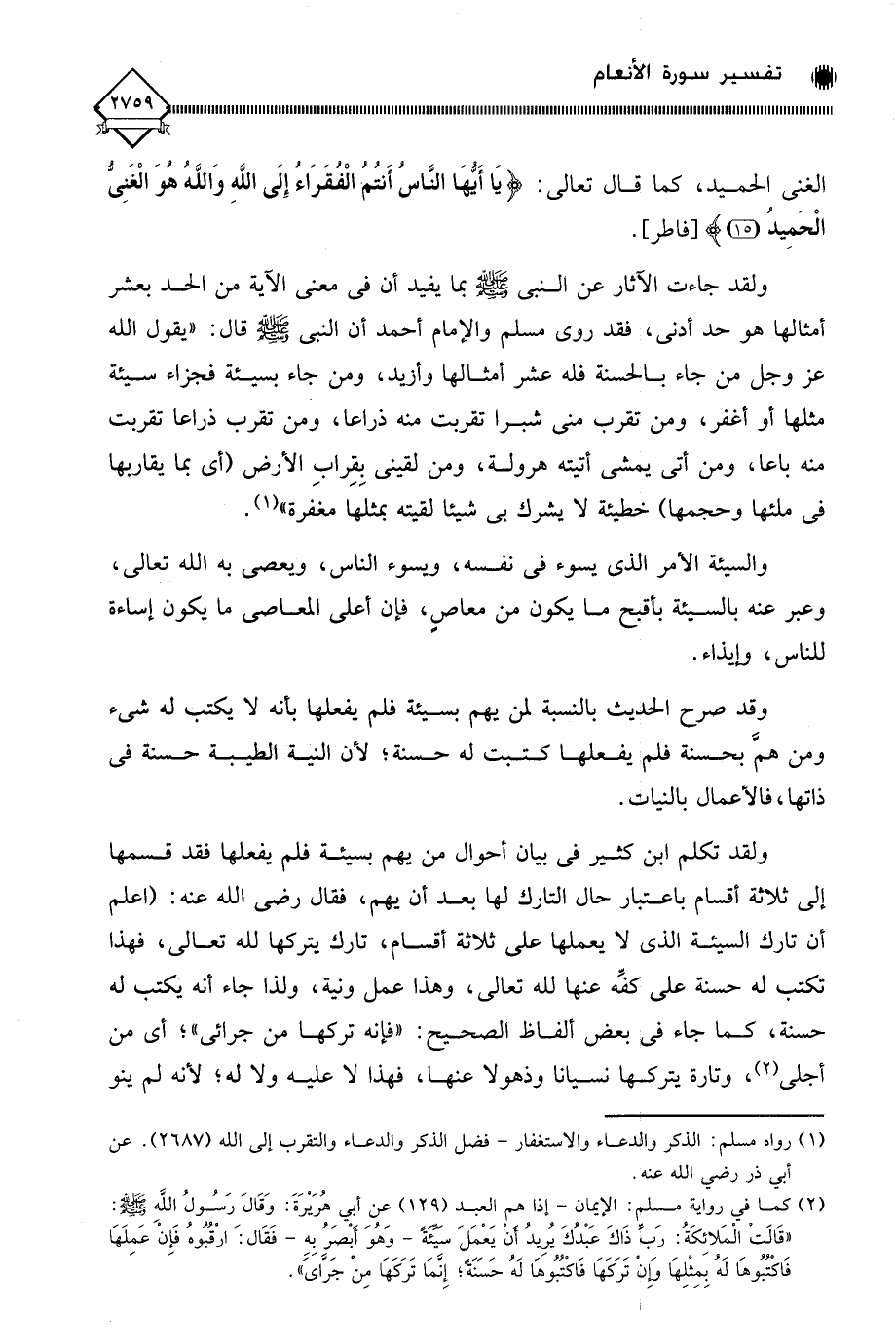 ولقد جاءت الآثار عن النبي - صلى الله عليه وسلم - بما يفيد أن في معنى الآية من الحد بعشر أمثالها هو حد أدنى، فقد روى مسلم والإمام أحمد أن النبي - صلى الله عليه وسلم - قال: " يقول الله عز وجل من جاء بالحسنة فله عشر أمثالها وأزيد، ومن جاء بسيئة فجزاء سيئة مثلها أو أغفر، ومن تقرب مني شبرا تقربت منه ذراعا، ومن تقرب ذراعا تقربت منه باعا، ومن أتى يمشي أتيته هرولة، ومن لقيني بِقِرابِ الأرض (أي بما يقاربها في ملئها وحجمها) خطيئة لَا يشرك بي شيئا لقيته بمثلها مغفرة، (¬1).