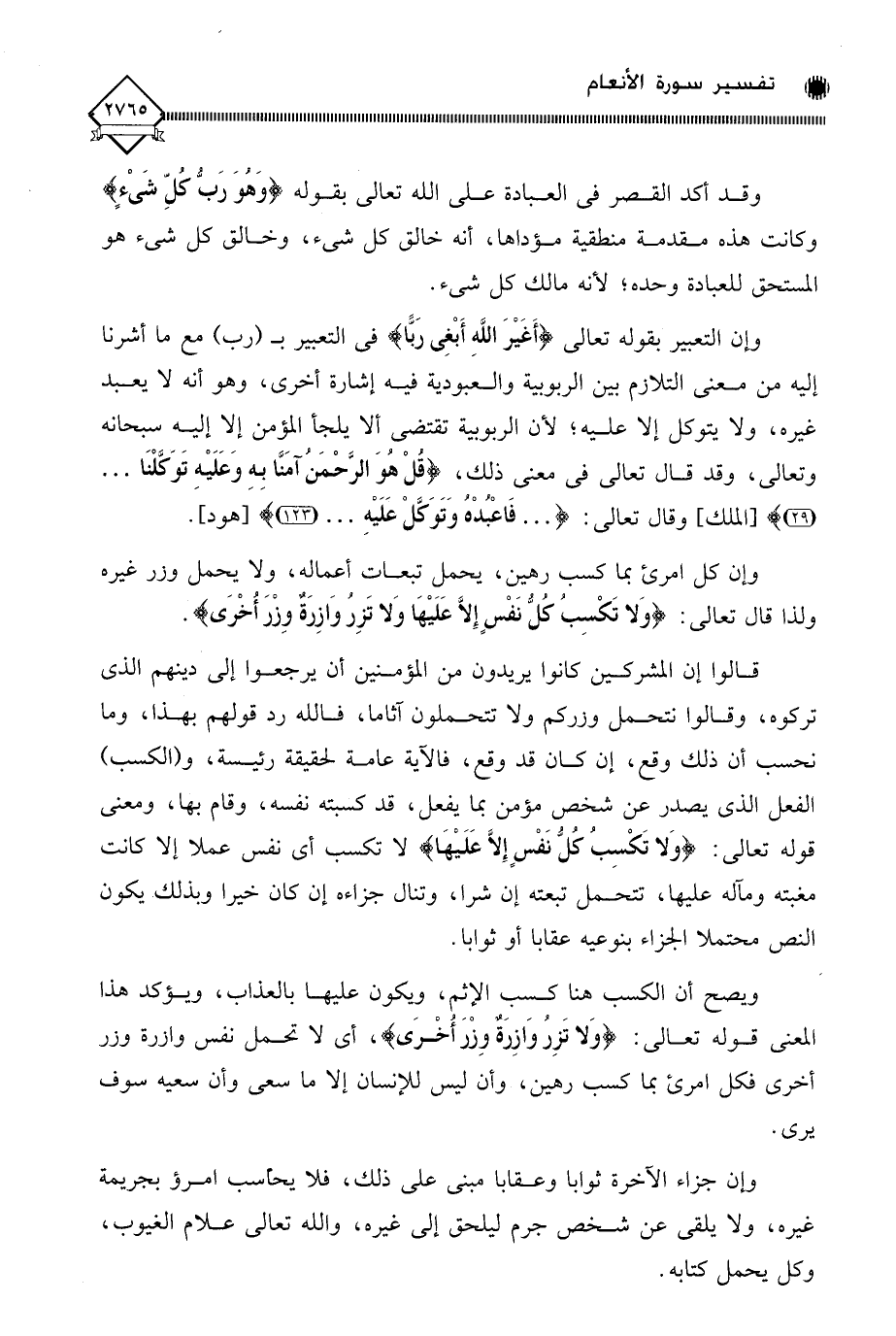 وإن التعبير بقوله تعالى (أَغَيْرَ اللَّهِ أَبْغِي رَبًّا) في التعبير بـ (رب) عما أشرنا إليه من معنى التلازم بين الربوبية والعبودية فيه إشارة أخرى، وهو أنه لَا يعبد غيره، ولا يتوكل إلا عليه؛ لأن الربوبية تقتضي ألا يلجأ المؤمن إلا إليه سبحانه وتعالى، وقد قال تعالى في معنى ذلك، (قلْ هُوَ الرَّحْمَنُ آمَنَّا بِهِ وَعَلَيْهِ تَوَكَّلْنَا. . .)، وقال تعالى: (. . . فَاعْبُدْهُ وَتَوَكَّلْ عَلَيْهِ. . .). وإن كل امرئٍ بما كسب رهين، يحمل تبعات أعماله، ولا يحمل وزر غيره ولذا قال تعالى: (وَلا تَكْسِبُ كُلّ نَفْسٍ إِلَّا عَلَيْهَا وَلا تَزِرُ وَازِرَةٌ وِزْرَ أُخْرَى).