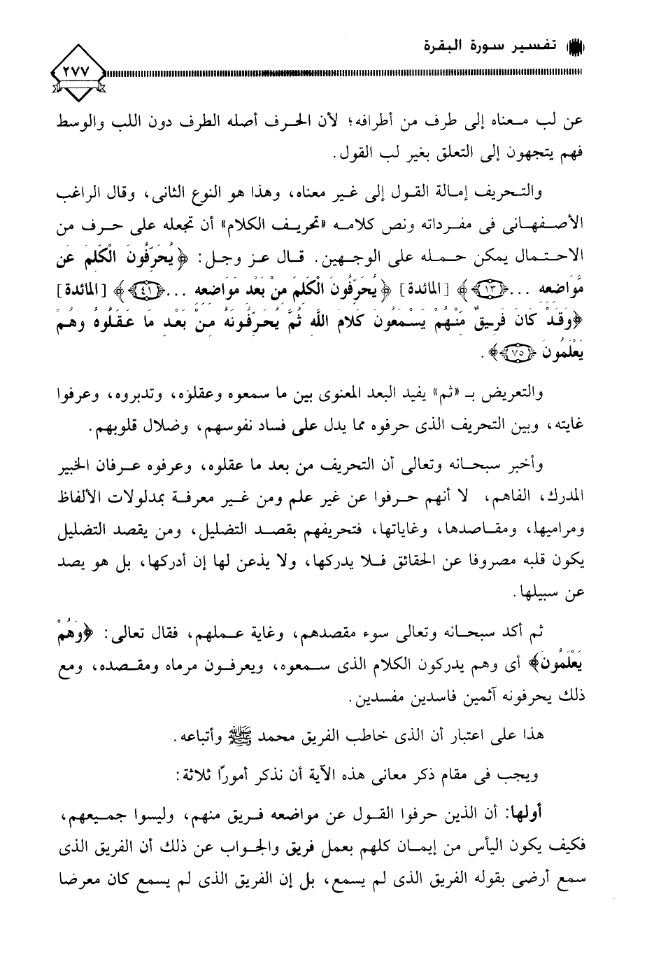 وأخبر سبحانه وتعالى أن التحريف من بعد ما عقلوه، وعرفوه عرفان الخبير المدرك، الفاهم، لَا أنهم حرفوا عن غير علم ومن غير معرفة بمدلولات الألفاظ ومراميها، ومقاصدها، وغاياتها، فتحريفهم بقصد التضليل، ومن يقصد التضليل يكون قلبه مصروفا عن الحقائق فلا يدركها، ولا يذعن لها إن أدركها، بل هو يصد عن سبيلها.