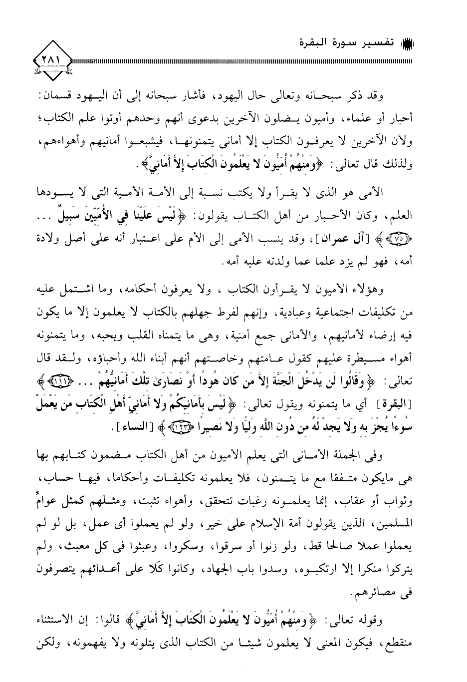 وفى الجملة الأماني التي يعلم الأميون من أهل الكتاب مضمون كتابهم بها هي ما يكون متفقا مع ما يتمنون، فلا يعلمونه تكليفات وأحكاما، فيها حساب، وثوب أو عقاب، إنما يعلمونه رغبات تتحقق، وأهواء تثبت، ومثلهم كمثل عوامِّ المسلمين، الذين يقولون أمة الإسلام على خير، ولو لم يعملوا أي عمل، بل لو لم يعملوا عملا صالحا قط، ولو زنوا أو سرقوا، وسكروا، وعبثوا في كل معبث، ولم يتركوا منكرا إلا ارتكبوه، وسدوا باب الجهاد، وكانوا كَلًّا على أعدائهم يتصرفون في مصائرهم.