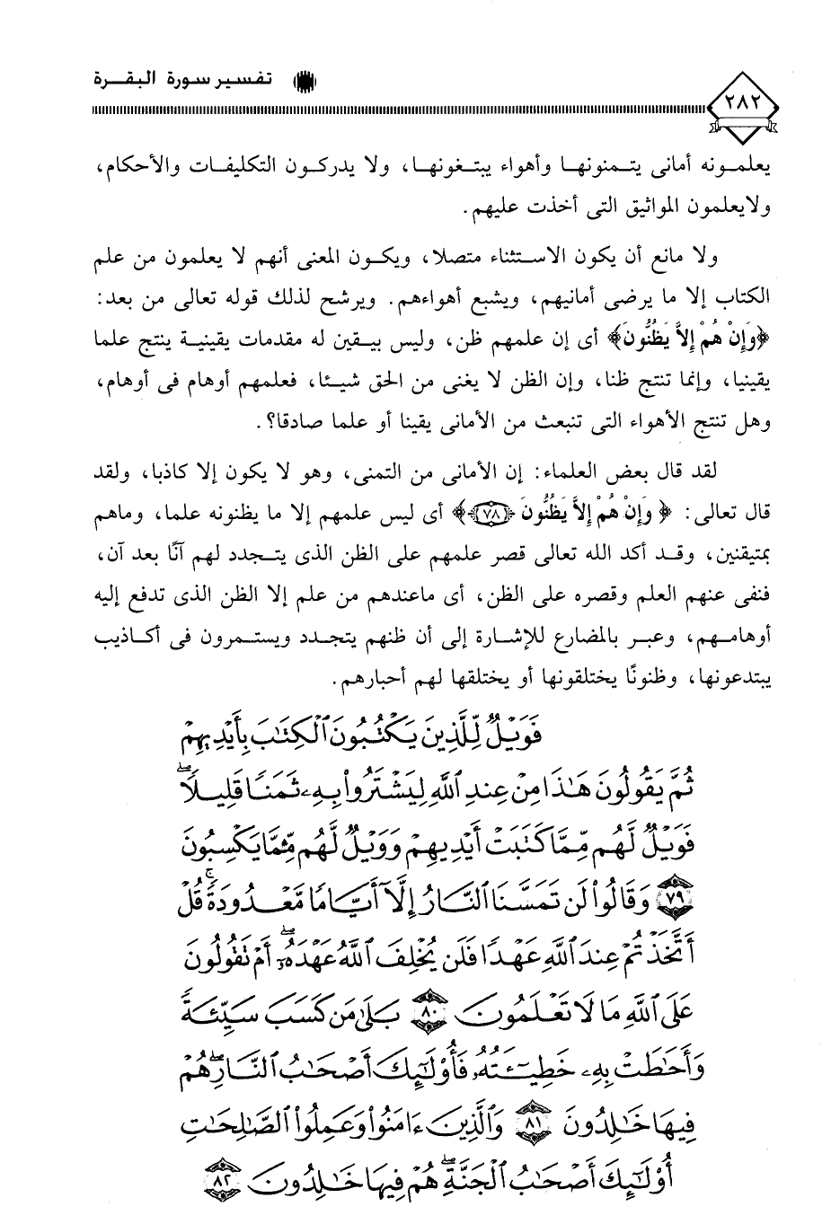 (فَوَيْلٌ لِلَّذِينَ يَكْتُبُونَ الْكِتَابَ بِأَيْدِيهِمْ ثُمَّ يَقُولُونَ هَذَا مِنْ عِنْدِ اللَّهِ لِيَشْتَرُوا بِهِ ثَمَنًا قَلِيلًا فَوَيْلٌ لَهُمْ مِمَّا كَتَبَتْ أَيْدِيهِمْ وَوَيْلٌ لَهُمْ مِمَّا يَكْسِبُونَ (79) وَقَالُوا لَنْ تَمَسَّنَا النَّارُ إِلَّا أَيَّامًا مَعْدُودَةً قُلْ أَتَّخَذْتُمْ عِنْدَ اللَّهِ عَهْدًا فَلَنْ يُخْلِفَ اللَّهُ عَهْدَهُ أَمْ تَقُولُونَ عَلَى اللَّهِ مَا لَا تَعْلَمُونَ (80) بَلَى مَنْ كَسَبَ سَيِّئَةً وَأَحَاطَتْ بِهِ خَطِيئَتُهُ فَأُولَئِكَ أَصْحَابُ النَّارِ هُمْ فِيهَا خَالِدُونَ (81) وَالَّذِينَ آمَنُوا وَعَمِلُوا الصَّالِحَاتِ أُولَئِكَ أَصْحَابُ الْجَنَّةِ هُمْ فِيهَا خَالِدُونَ (82)