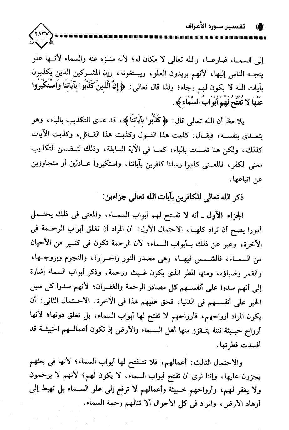 الجزاء الأول - أنه لَا تفتح لهم أبواب السماء، والمعنى في ذلك يحتمل أمورا يصح أن تراد كلها، الاحتمال الأول: أن المراد أن تغلق أبواب الرحمة في الآخرة، وعبر عن ذلك بأبواب السماء؛ لأن الرحمة تكون في كثير من الأحيان من السماء، فالشمس فيها، وهي مصدر النور والحرارة، والنجوم وبروجها، والقمر وضياؤه، ومنها المطر الذي يكون غيث ورحمة، وذكر أبواب السماء إشارة إلى أنهم سدوا على أنفسهم كل مصادر الرحمة والغفران؛ لأنهم سدوا كل سبل الخير على أنفسهم في الدنيا، فحق عليهم هذا في الآخرة. الاحتمال الثاني: أن يكون المراد أرواحهم، فأرواحهم لَا تفتح لها أبواب السماء، بل تغلق دونها؛ لأنها أرواح خبيثة نتنة يتقزز منها أهل السماء والأرض إذ تكون أعمالهم الخبيثة قد أفسدت فطرتها.