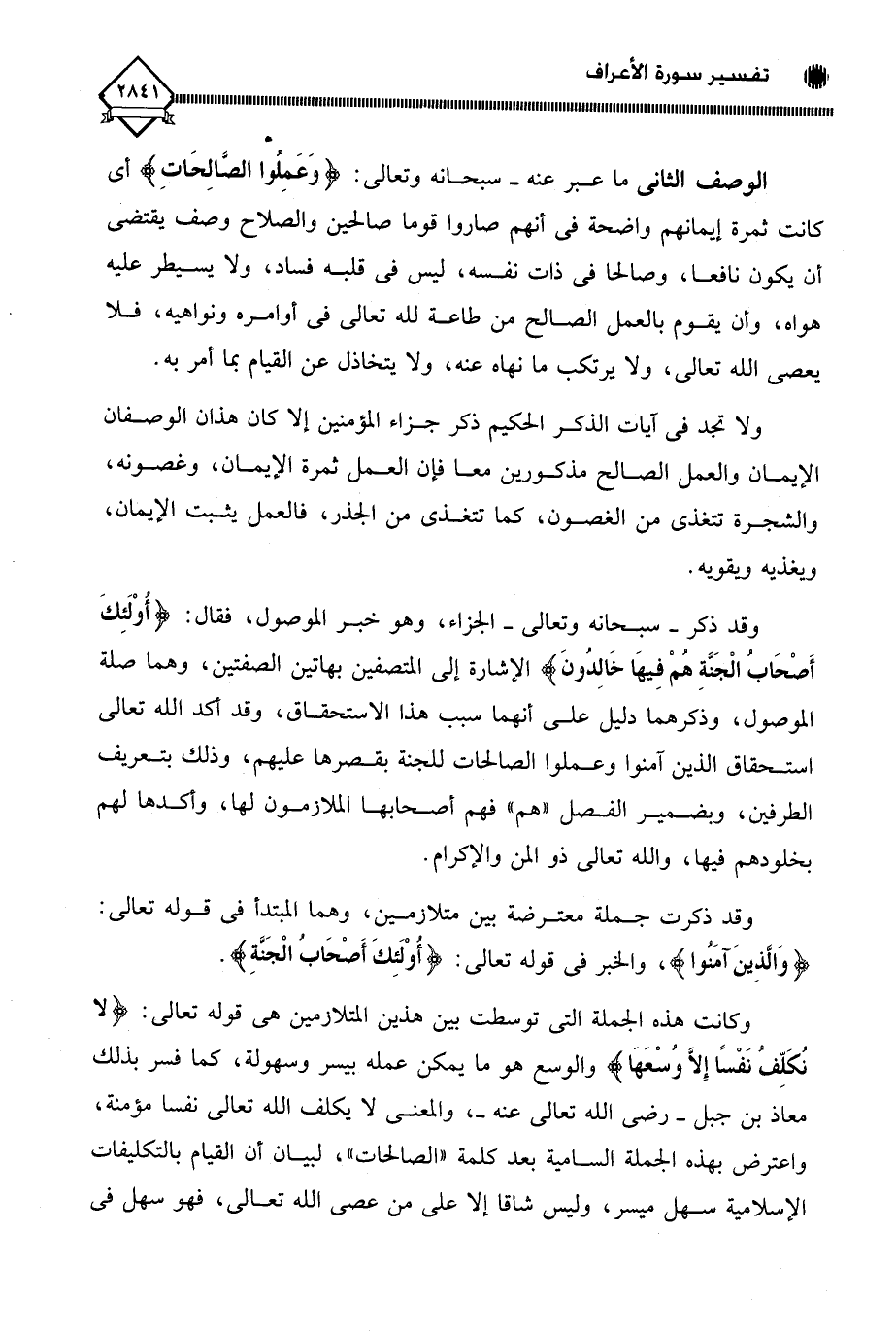 ولا تجد في آيات الذكر الحكيم ذكر جزاء المؤمنين إلا كان هذان الوصفان الإيمان والعمل الصالح مذكورين معا فإن العمل ثمرة الإيمان، وغصونه، والشجرة تتغذى من الغصون، كما تتغذى من الجذر، فالعمل يثبت الإيمان، ويغذيه ويقويه.