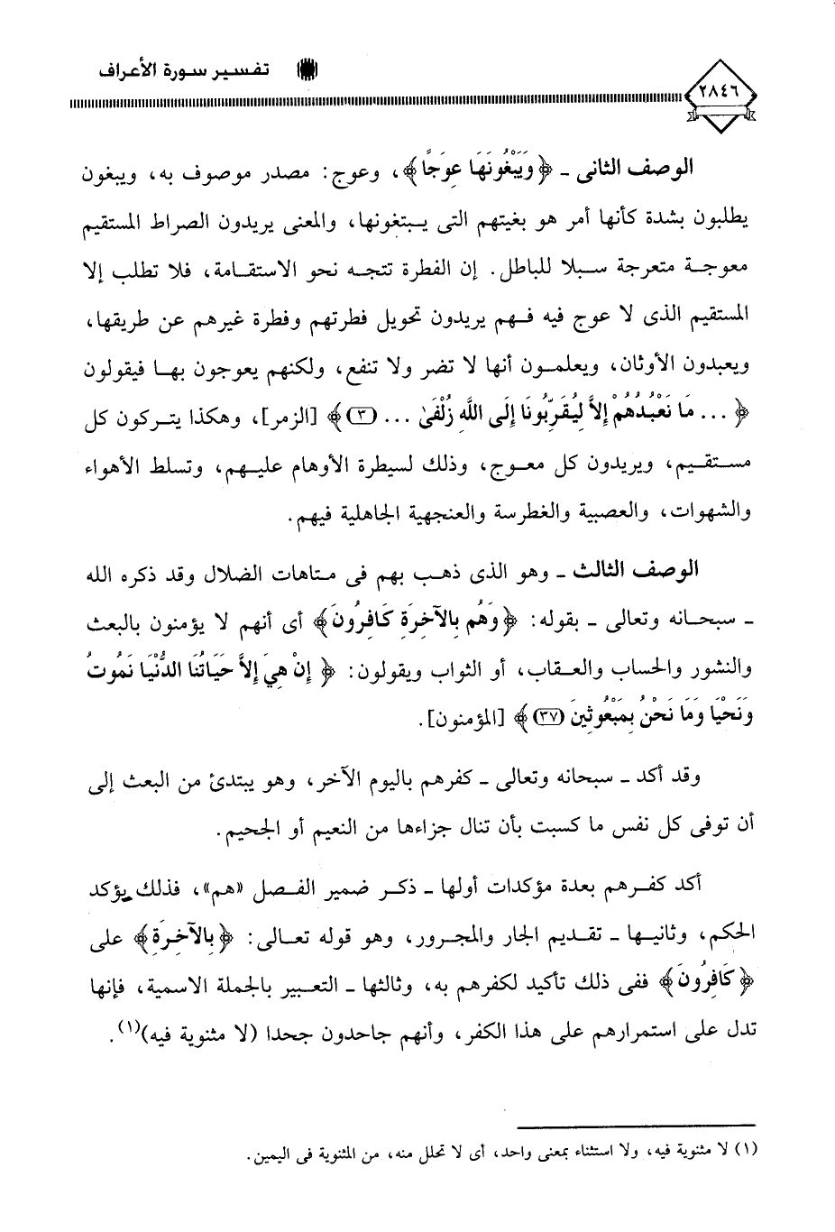 الوصف الثاني - (وَيَبْغُونَهَا عِوَجًا)، وعوج: مصدر موصوف به، ويبغون يطلبون بشدة كأنها أمر هو بغيتهم التي يبتغونها، والمعنى يريدون الصراط المستقيم معوجة متعرجة سبلا للباطل. إن الفطرة تتجه نحو الاستقامة، فلا تطلب إلا المستقيم الذي لَا عوج فيه فهم يريدون تحويل فطرتهم وفطرة غيرهم عن طريقها، ويعبدون الأوثان، ويعلمون أنها لَا تضر ولا تنفع، ولكنهم يعوجون بها فيقولون (. . . مَا نَعْبُدُهُمْ إِلَّا لِيُقَرِّبُونَا إِلَى اللَّهِ زُلْفَى. . .)، وهكذا يتركون كل مستقيم، ويريدون كل معوج، وذلك لسيطرة الأوهام عليهم، وتسلط الأهواء والشهوات، والعصبية والغطرسة والعنجهية الجاهلية فيهم.