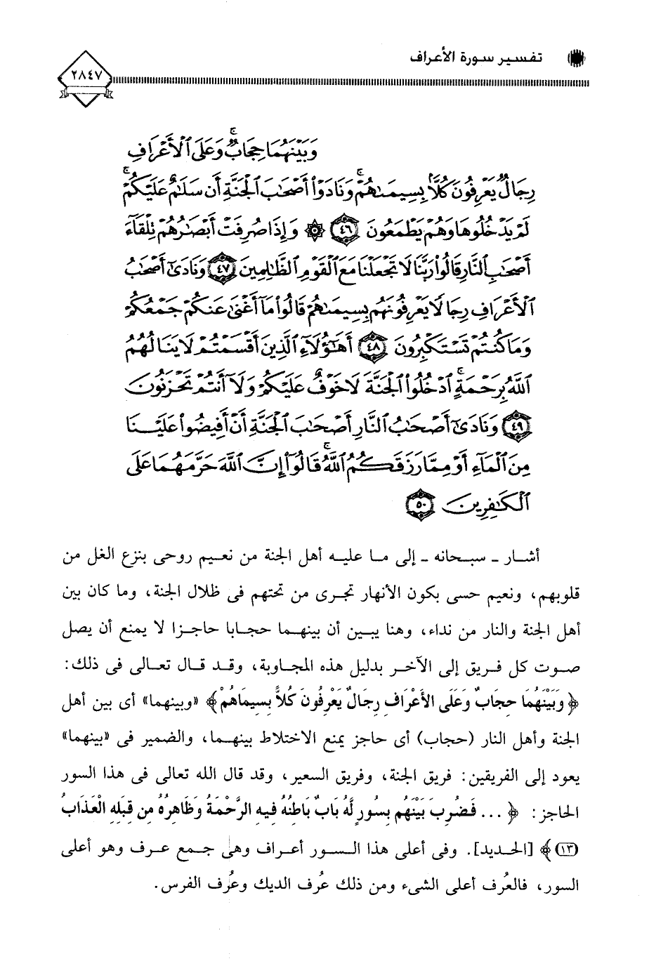 (وَبَيْنَهُمَا حِجَابٌ وَعَلَى الْأَعْرَافِ رِجَالٌ يَعْرِفُونَ كُلًّا بِسِيمَاهُمْ) " وبينهما " أي بين أهل الجنة وأهل النار (حجاب) أي حاجز يمنع الاختلاط بينهما، والضمير في " بينهما " يعود إلى الفريقين: فريق الجنة، وفريق السعير، وقد قال الله تعالى في هذا السور الحاجز: (. . . فَضُرِبَ بَيْنَهُم بِسُورٍ لهُ بَابٌ بَاطِنُهُ فِيهِ الرَّحْمَةُ وَظَاهِرُهُ مِن قِبَلِهِ الْعَذَابُ). وفي أعلى هذا المسور أعراف وهي جمع عرف وهو أعلى السور، فالعُرف أعلى الشيء ومن ذلك عُرف الديك وعُرف الفرس.