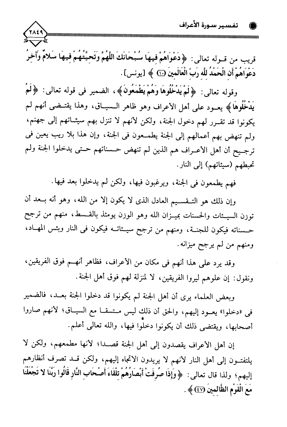 وقوله تعالى: (لَمْ يَدْخلُوهَا وَهُمْ يَطْمَعُونَ)، الضمير في قوله تعالى: (لَمْ يَدْخلُوهَا) يعود على أهل الأعراف وهو ظاهر السياق، وهذا يقتضي أنهم لم يكونوا قد تقرر لهم دخول الجنة، ولكن لأنهم لَا تنزل بهم سيئاتهم إلى جهنم، ولم تنهض بهم أعمالهم إلى الجنة يطمعون في الجنة، وإن هذا بلا ريب يعين في ترجيح أن أهل الأعراف هم الذين لم تنهض حسناتهم حتى يدخلوا الجنة ولم تحبطهم (سيئاتهم) إلى النار.