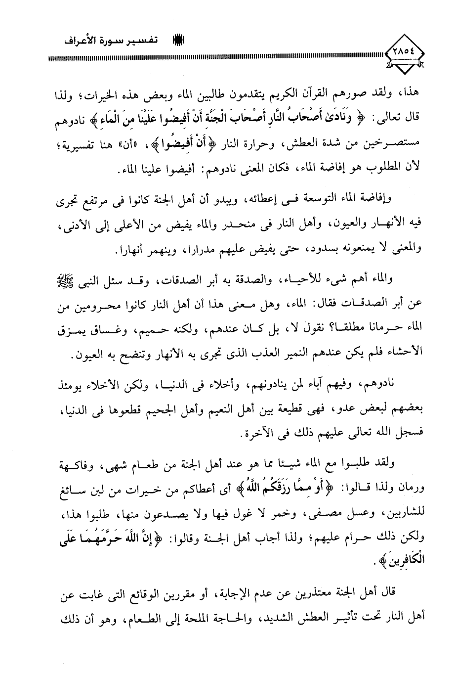 وإفاضة الماء التوسعة في إعطائه، ويبدو أن أهل الجنة كانوا في مرتفع تجري فيه الأنهار والعيون، وأهل النار في منحدر والماء يفيض من الأعلى إلى الأدنى، والمعنى لَا يمنعونه بسدود، حتى يفيض عليهم مدرارا، وينهمر أنهارا.
