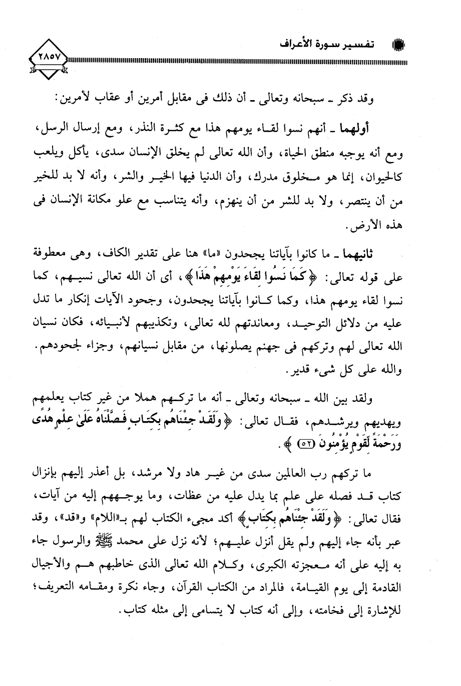(وَلَقَدْ جِئْنَاهُمْ بِكِتَابٍ فَصَّلْنَاهُ عَلَى عِلْمٍ هُدًى وَرَحْمَةً لِقَوْمٍ يُؤْمِنُونَ (52)