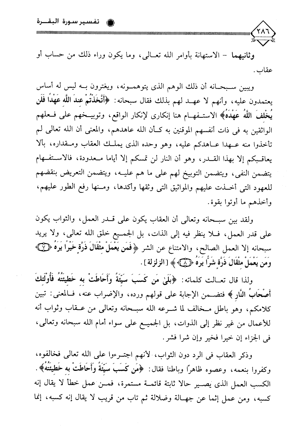 ولقد بين سبحانه وتعالى أن العقاب يكون على قدر العمل، والثواب يكون على قدر العمل، فلا ينظر فيه إلى الذات، بل الجميع خلق الله تعالى، ولا يريد سبحانه إلا العمل الصالح، والامتناع عن الشر (فَمَنْ يَعْمَلْ مِثْقَالَ ذَرَّةٍ خَيْرًا يَرَهُ (7) وَمَنْ يَعْمَلْ مِثْقَالَ ذَرَّةٍ شَرًّا يَرَهُ (8). ولذا قال تعالت كلماته: