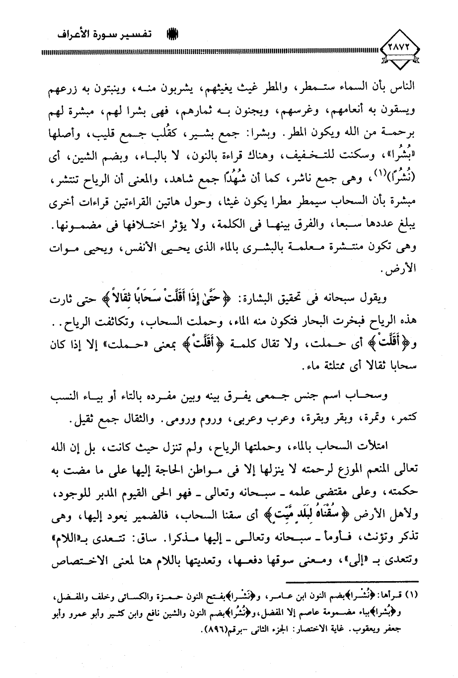 الناس بأن السماء ستمطر، والمطر غيث يغيثهم، يشربون منه، وينبتون به زرعهم ويسقون به أنعامهم، وغرسهم، ويجنون به ثمارهم، فهي بشرا لهم، مبشرة لهم برحمة من الله ويكون المطر. وبشرا: جمع بشير، كقُلب جمع قليب، وأصلها " بُشُرًا "، وسكنت للتخفيف، وهناك قراءة بالنون، لَا بالباء، وبضم الشين، أي (نُشُرًا) (¬1)، وهي جمع ناشر، كما أن شهدًا جمع شاهد، والمعنى أن الرياح تنتشر، مبشرة بأن السحاب سيمطر مطرا يكون غيثا، وحول هاتين القراءتين قراءات أخرى يبلغ عددها سبعا، والفرق بينها في الكلمة، ولا يؤثر اختلافها في مضمونها.