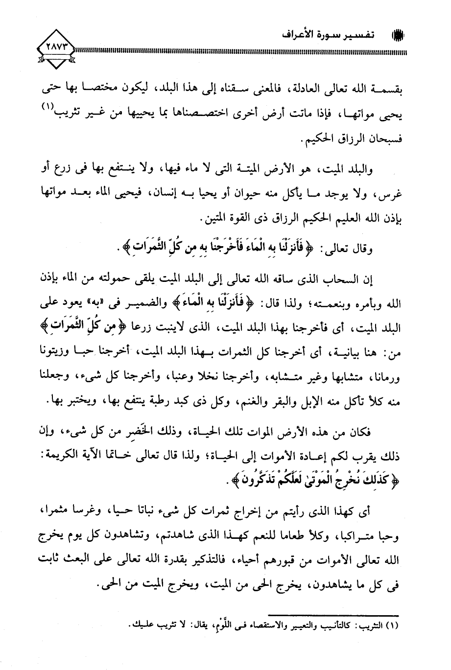 إن السحاب الذي ساقه الله تعالى إلى البلد الميت يلقي حمولته من الماء بإذن الله وبأمره وبنعمته؛ ولذا قال: (فَأنزَلْنَا بِهِ الْمَاءَ) والضمير في (به) يعود على البلد الميت، أي فاخرجنا بهذا البلد الميت، الذي لَا ينبت زرعا (مِن كُل الثمَرَاتِ) من: هنا بيانية، أي أخرجنا كل الثمرات بهذا البلد الميت، أخرجنا حبا وزيتونا ورمانا، متشابها وغير متشابه، وأخرجنا نخلا وعنبا، وأخرجنا كل شيء، وجعلنا منه كلأ تأكل منه الإبل والبقر والغنم، وكل ذي كبد رطبة ينتفع بها، ويختبر بها.