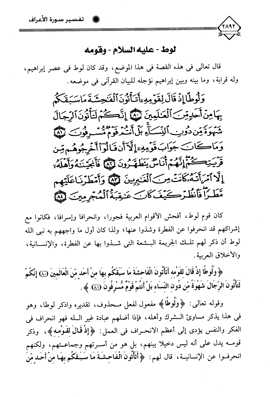 (وَلُوطًا إِذْ قَالَ لِقَوْمِهِ أَتَأْتُونَ الْفَاحِشَةَ مَا سَبَقَكُمْ بِهَا مِنْ أَحَدٍ مِنَ الْعَالَمِينَ (80) إِنَّكُمْ لَتَأْتُونَ الرِّجَالَ شَهْوَةً مِنْ دُونِ النِّسَاءِ بَلْ أَنْتُمْ قَوْمٌ مُسْرِفُونَ (81) وَمَا كَانَ جَوَابَ قَوْمِهِ إِلَّا أَنْ قَالُوا أَخْرِجُوهُمْ مِنْ قَرْيَتِكُمْ إِنَّهُمْ أُنَاسٌ يَتَطَهَّرُونَ (82) فَأَنْجَيْنَاهُ وَأَهْلَهُ إِلَّا امْرَأَتَهُ كَانَتْ مِنَ الْغَابِرِينَ (83) وَأَمْطَرْنَا عَلَيْهِمْ مَطَرًا فَانْظُرْ كَيْفَ كَانَ عَاقِبَةُ الْمُجْرِمِينَ (84)