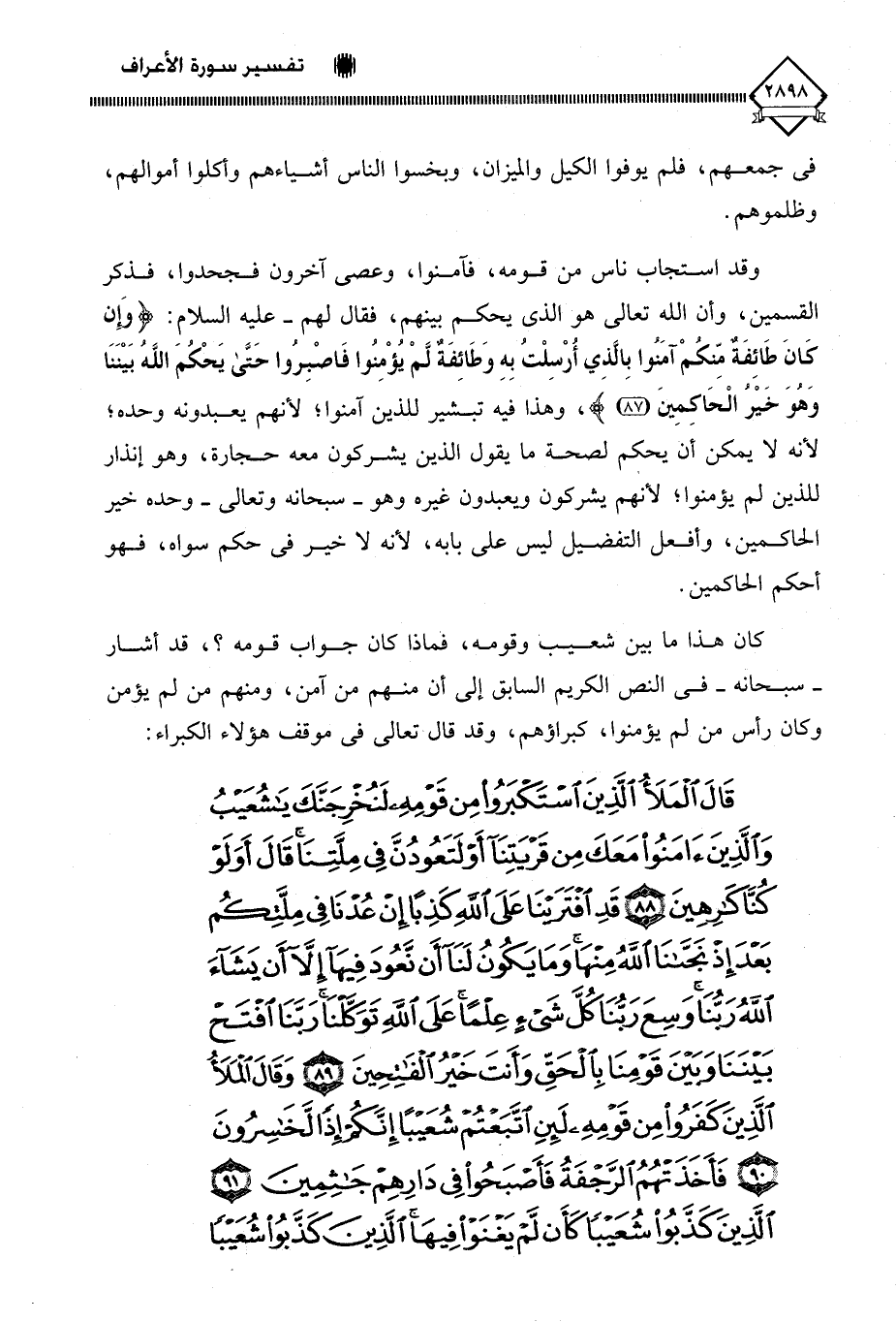 (قَالَ الْمَلَأُ الَّذِينَ اسْتَكْبَرُوا مِنْ قَوْمِهِ لَنُخْرِجَنَّكَ يَا شُعَيْبُ وَالَّذِينَ آمَنُوا مَعَكَ مِنْ قَرْيَتِنَا أَوْ لَتَعُودُنَّ فِي مِلَّتِنَا قَالَ أَوَلَوْ كُنَّا كَارِهِينَ (88) قَدِ افْتَرَيْنَا عَلَى اللَّهِ كَذِبًا إِنْ عُدْنَا فِي مِلَّتِكُمْ بَعْدَ إِذْ نَجَّانَا اللَّهُ مِنْهَا وَمَا يَكُونُ لَنَا أَنْ نَعُودَ فِيهَا إِلَّا أَنْ يَشَاءَ اللَّهُ رَبُّنَا وَسِعَ رَبُّنَا كُلَّ شَيْءٍ عِلْمًا عَلَى اللَّهِ تَوَكَّلْنَا رَبَّنَا افْتَحْ بَيْنَنَا وَبَيْنَ قَوْمِنَا بِالْحَقِّ وَأَنْتَ خَيْرُ الْفَاتِحِينَ (89) وَقَالَ الْمَلَأُ الَّذِينَ كَفَرُوا مِنْ قَوْمِهِ لَئِنِ اتَّبَعْتُمْ شُعَيْبًا إِنَّكُمْ إِذًا لَخَاسِرُونَ (90) فَأَخَذَتْهُمُ الرَّجْفَةُ فَأَصْبَحُوا فِي دَارِهِمْ جَاثِمِينَ (91) الَّذِينَ كَذَّبُوا شُعَيْبًا كَأَنْ لَمْ يَغْنَوْا فِيهَا الَّذِينَ كَذَّبُوا شُعَيْبًا