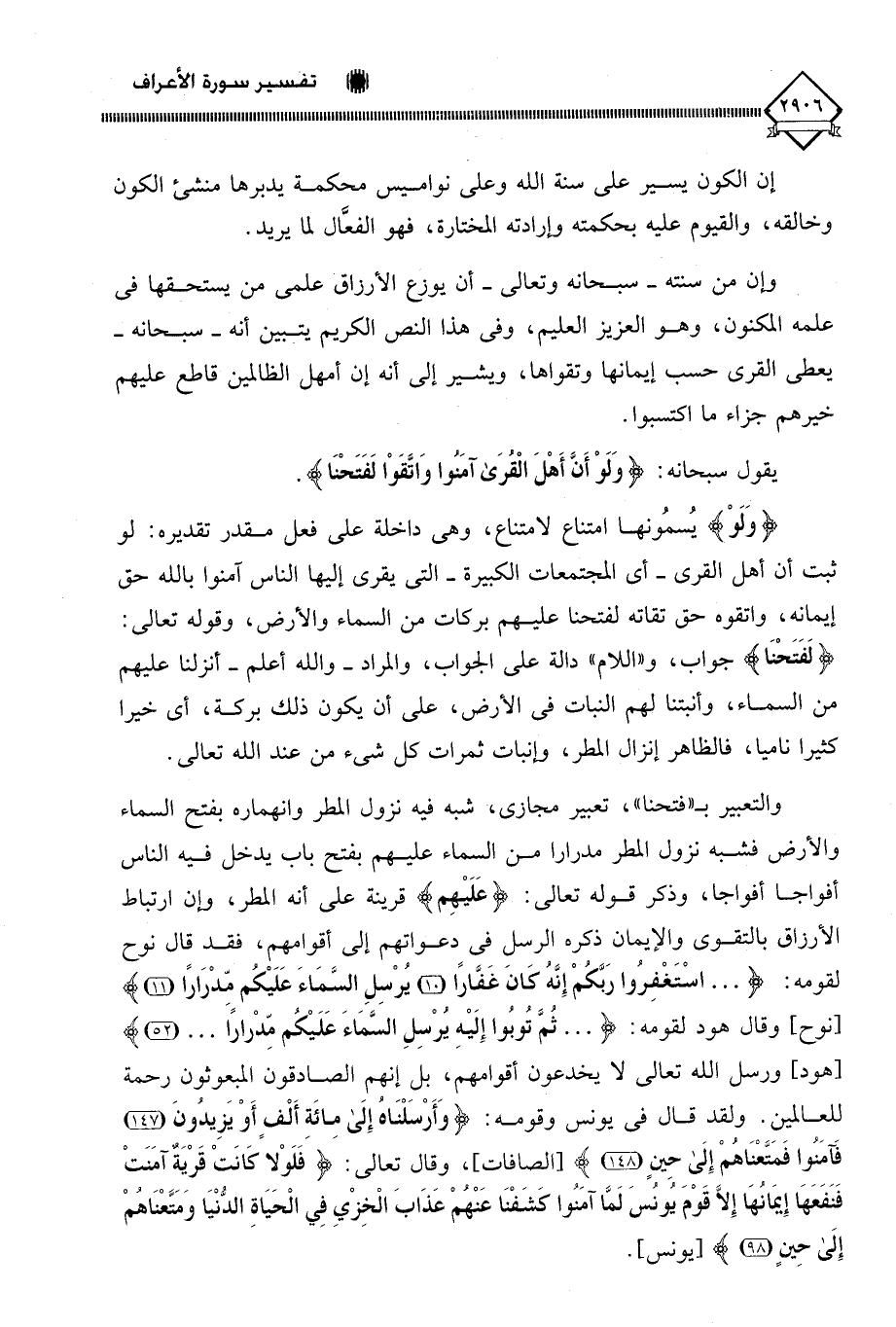 وإن من سنته - سبحانه وتعالى - أن يوزع الأرزاق علمي من يستحقها في علمه المكنون، وهو العزيز العليم، وفي هذا النص الكريم يتبين أنه - سبحانه - يعطي القرى حسب إيمانها وتقواها، ويشير إلى أنه إن أمهل الظالمين قاطع عليهم خيرهم جزاء ما اكتسبوا.