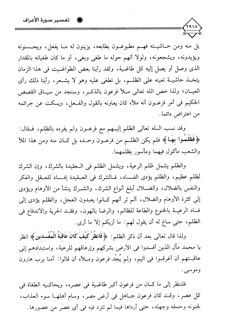 والظلم يشمل ظلم الرعية، ويشمل الظلم في العقيدة بالشرك، وإن الشرك لظلم عظيم، والظلم يؤدي الفساد، فالشرك في العقيدة إفساد للعقل والفكر والنفس بالضلال، والضلال أبلغ أنواع الشرك، والشرك ينشأ من الأوهام ويؤدي إلى كثرة الأوهام والضلال، ألم تر أنهم كانوا يعبدون العجل، والظلم يؤدي إلى فساد الرعية بالخنوع والطاعة للظالم، والرضا بالهون، وفقد الحرية والاندفاع في الظلم، حتى ساغ له أن يقول لهم: مَا أُرِيكُمْ إِلَّا مَا أَرَى.