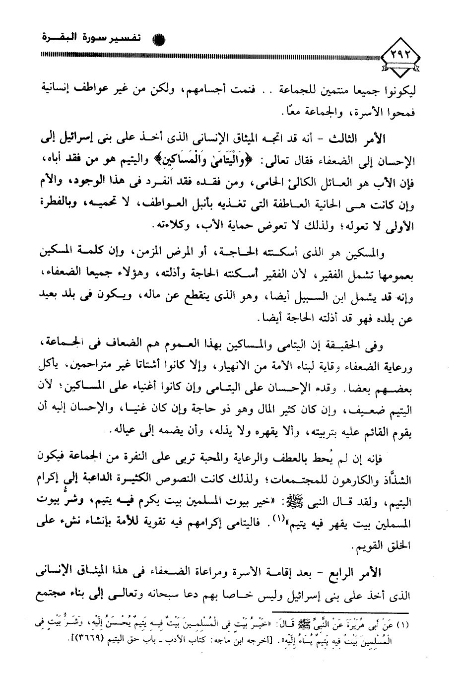 الأمر الثالث - أنه قد اتجه الميثاق الإنساني الذي أخذ على بني إسرائيل إلى الإحسان إلى الضعفاء فقال تعالى: (وَالْيَتَامَى وَالْمَسَاكِين) واليتيم هو من ققد أباه، فإن الأب هو العائل الكالئ الحامي، ومن فقده فقد انفرد في هذا الوجود، والأم وإن كانت هي الحانية العاطفة التي تغذيه بأنبل العواطف، لَا تحميه، وبالفطرة الأولى لَا تعوله؛ ولذلك لَا تعوض حماية الأب، وكلاءته.