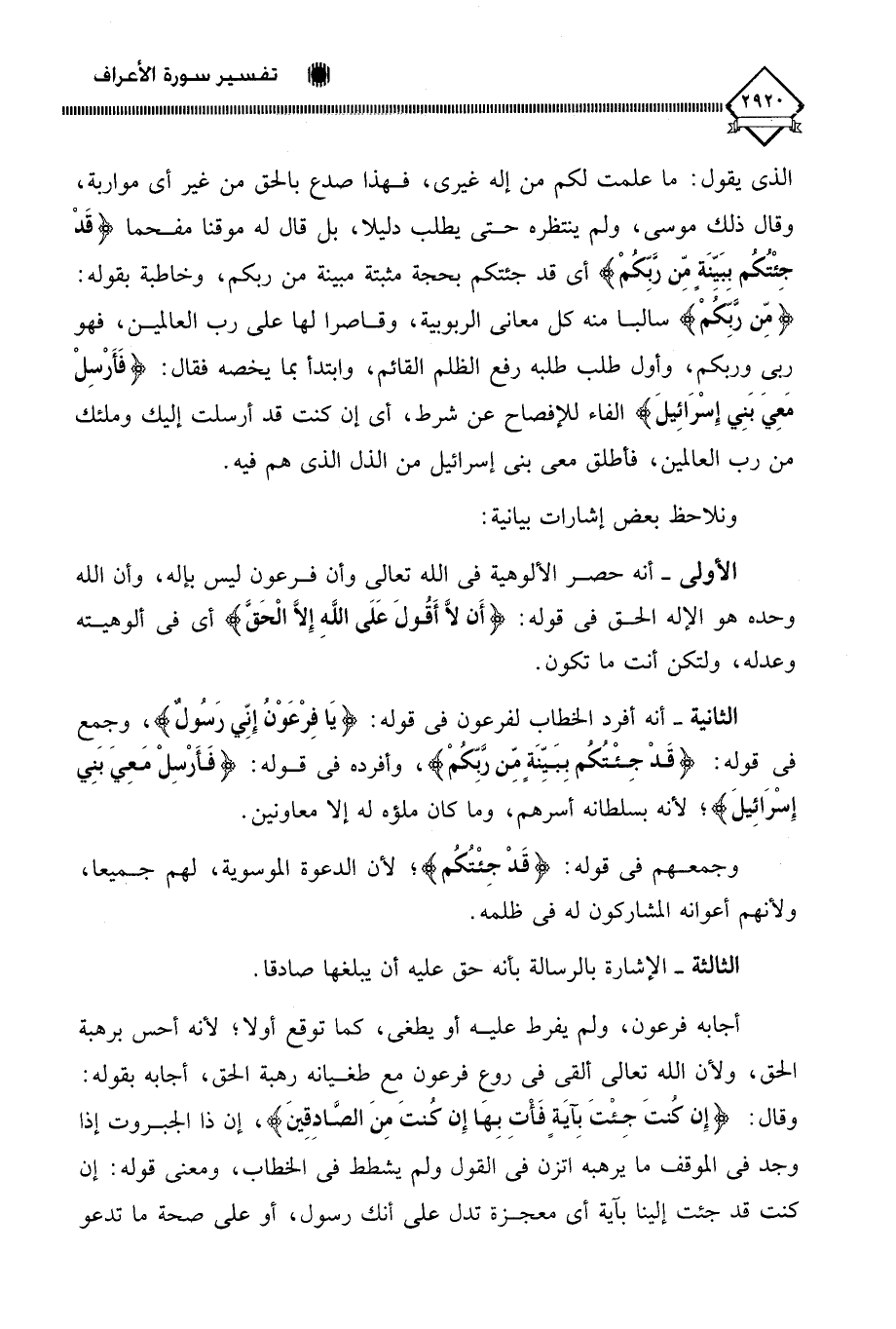 الثانية - أنه أفرد الخطاب لفرعون في قوله: (يَا فِرْعَوْنُ إِنِّي رَسُولٌ)، وجمع في قوله: (قَدْ جِئْتُكُم بِبَيِّنَةٍ مِّن رَّبِّكُمْ)، وأفرده في قوله: (فَأَرْسِلْ مَعِيَ بنِي إِسْرَائِيلَ)؛ لأنه بسلطانه أسرهم، وما كان ملؤه له إلا معاونين.