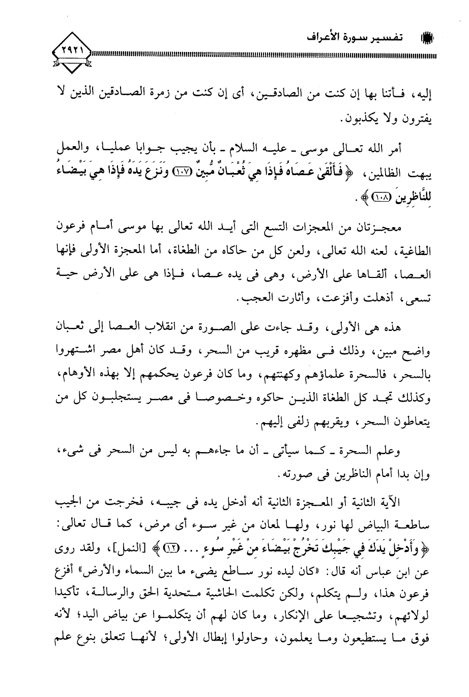 (فَأَلْقَى عَصَاهُ فَإِذَا هِيَ ثُعْبَانٌ مُبِينٌ (107) وَنَزَعَ يَدَهُ فَإِذَا هِيَ بَيْضَاءُ لِلنَّاظِرِينَ (108).