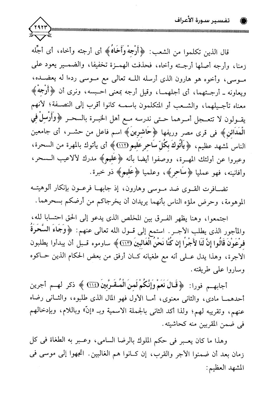 قال الذين تكلموا من الشعب: (أَرْجِهْ وَأَخَاهُ) أي أرجئه وأخاه، أي أجِّله زمنا، وأرجه أصلها أرجئه وأخاه، فحذفت الهمزة تخفيفا، والضمير يعود على موسى، وأخوه هو هارون الذي أرسله الله تعالى مع موسى ردءا له يعضده، ويعاونه - أرجئهما، أي أجلهما، وقيل أرجه بمعنى احبسه، ونرى أن (أَرْجِهْ) معناه تأجيلهما، والشعب أو المتكلمون باسمه كانوا أقرب إلى الحصفة؛ لأنهم يقولون لَا تتعجل أمرهما حتى ندرسه مع أهل الخبرة بالسحر (وَأَرْسِلْ فِي الْمَدَائِنِ) في قرئ مصر وريفها (حَاشِرِينَ) اسم فاعل من حشر، أي جامعين الناس لمشهد عظيم،