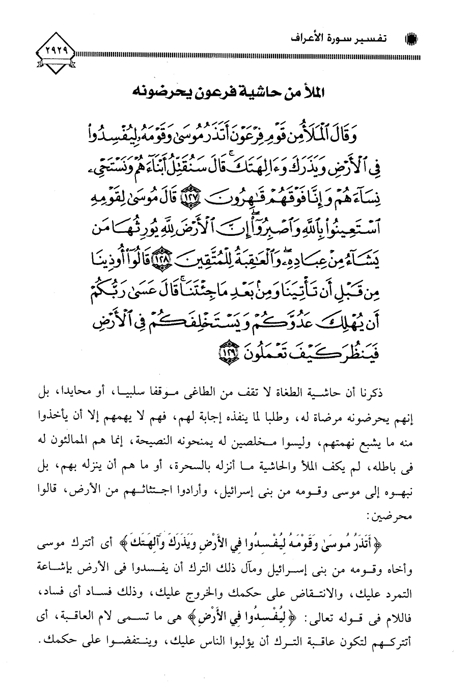 (وَقَالَ الْمَلَأُ مِنْ قَوْمِ فِرْعَوْنَ أَتَذَرُ مُوسَى وَقَوْمَهُ لِيُفْسِدُوا فِي الْأَرْضِ وَيَذَرَكَ وَآلِهَتَكَ قَالَ سَنُقَتِّلُ أَبْنَاءَهُمْ وَنَسْتَحْيِي نِسَاءَهُمْ وَإِنَّا فَوْقَهُمْ قَاهِرُونَ (127) قَالَ مُوسَى لِقَوْمِهِ اسْتَعِينُوا بِاللَّهِ وَاصْبِرُوا إِنَّ الْأَرْضَ لِلَّهِ يُورِثُهَا مَنْ يَشَاءُ مِنْ عِبَادِهِ وَالْعَاقِبَةُ لِلْمُتَّقِينَ (128) قَالُوا أُوذِينَا مِنْ قَبْلِ أَنْ تَأْتِيَنَا وَمِنْ بَعْدِ مَا جِئْتَنَا قَالَ عَسَى رَبُّكُمْ أَنْ يُهْلِكَ عَدُوَّكُمْ وَيَسْتَخْلِفَكُمْ فِي الْأَرْضِ فَيَنْظُرَ كَيْفَ تَعْمَلُونَ (129)