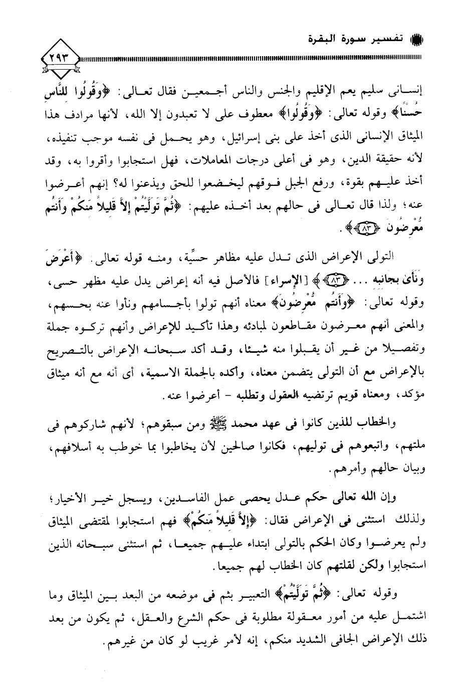 إنساني يعم يعم الإقليم والجنس والناس أجمعين فقال تعالى: (وَقُولُوا لِلنَّاسِ حُسْنًا) وقوله تعالى: (وَقُولُوا) معطوف على لَا تعبدون إلا الله، لأنها مرادف هذا الميثاق الإنساني الذي أخذ على بني إسرائيل، وهو يحمل في نفسه موجب تنفيذه، لأنه حقيقة الدين، وهو في أعلى درجات المعاملات، فهل استجابوا وأقروا به، وقد أخذ عليهم بقوة، ورفع الجبل فوقهم ليخضعوا للحق ويذعنوا له؛ إنهم أعرضوا عنه؛ ولذا قال تعالى في حالهم بعد أخذه عليهم: (ثُمَّ تَوَلَّيتمْ إِلَّا قليلًا مّنكُمْ وَأَنتُم مُّعْرِضُونَ).
