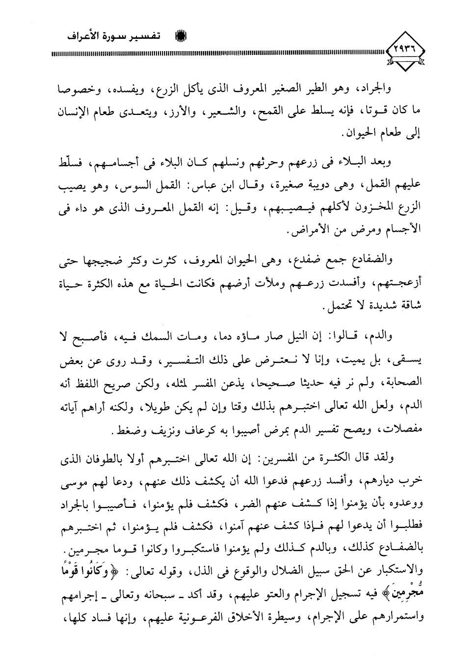 والدم، قالوا: إن النيل صار ماؤه دما، ومات السمك فيه، فأصبح لا يسقي، بل يميت، وإنا لَا نعترض على ذلك التفسير، وقد روي عن بعض الصحابة، ولم نر فيه حديثا صحيحا، يذعن المفسر لمثله، ولكن صريح اللفظ أنه الدم، ولعل الله تعالى اختبرهم بذلك وقتا وإن لم يكن طويلا، ولكنه أراهم آياته مفصلات، ويصح تفسير الدم بمرض أصيبوا به كرعاف ونزيف وضغط.