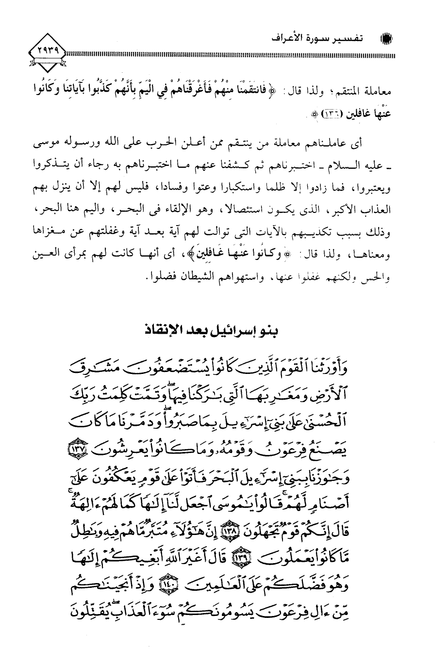 (وَأَوْرَثْنَا الْقَوْمَ الَّذِينَ كَانُوا يُسْتَضْعَفُونَ مَشَارِقَ الْأَرْضِ وَمَغَارِبَهَا الَّتِي بَارَكْنَا فِيهَا وَتَمَّتْ كَلِمَتُ رَبِّكَ الْحُسْنَى عَلَى بَنِي إِسْرَائِيلَ بِمَا صَبَرُوا وَدَمَّرْنَا مَا كَانَ يَصْنَعُ فِرْعَوْنُ وَقَوْمُهُ وَمَا كَانُوا يَعْرِشُونَ (137) وَجَاوَزْنَا بِبَنِي إِسْرَائِيلَ الْبَحْرَ فَأَتَوْا عَلَى قَوْمٍ يَعْكُفُونَ عَلَى أَصْنَامٍ لَهُمْ قَالُوا يَا مُوسَى اجْعَلْ لَنَا إِلَهًا كَمَا لَهُمْ آلِهَةٌ قَالَ إِنَّكُمْ قَوْمٌ تَجْهَلُونَ (138) إِنَّ هَؤُلَاءِ مُتَبَّرٌ مَا هُمْ فِيهِ وَبَاطِلٌ مَا كَانُوا يَعْمَلُونَ (139) قَالَ أَغَيْرَ اللَّهِ أَبْغِيكُمْ إِلَهًا وَهُوَ فَضَّلَكُمْ عَلَى الْعَالَمِينَ (140) وَإِذْ أَنْجَيْنَاكُمْ مِنْ آلِ فِرْعَوْنَ يَسُومُونَكُمْ سُوءَ الْعَذَابِ يُقَتِّلُونَ