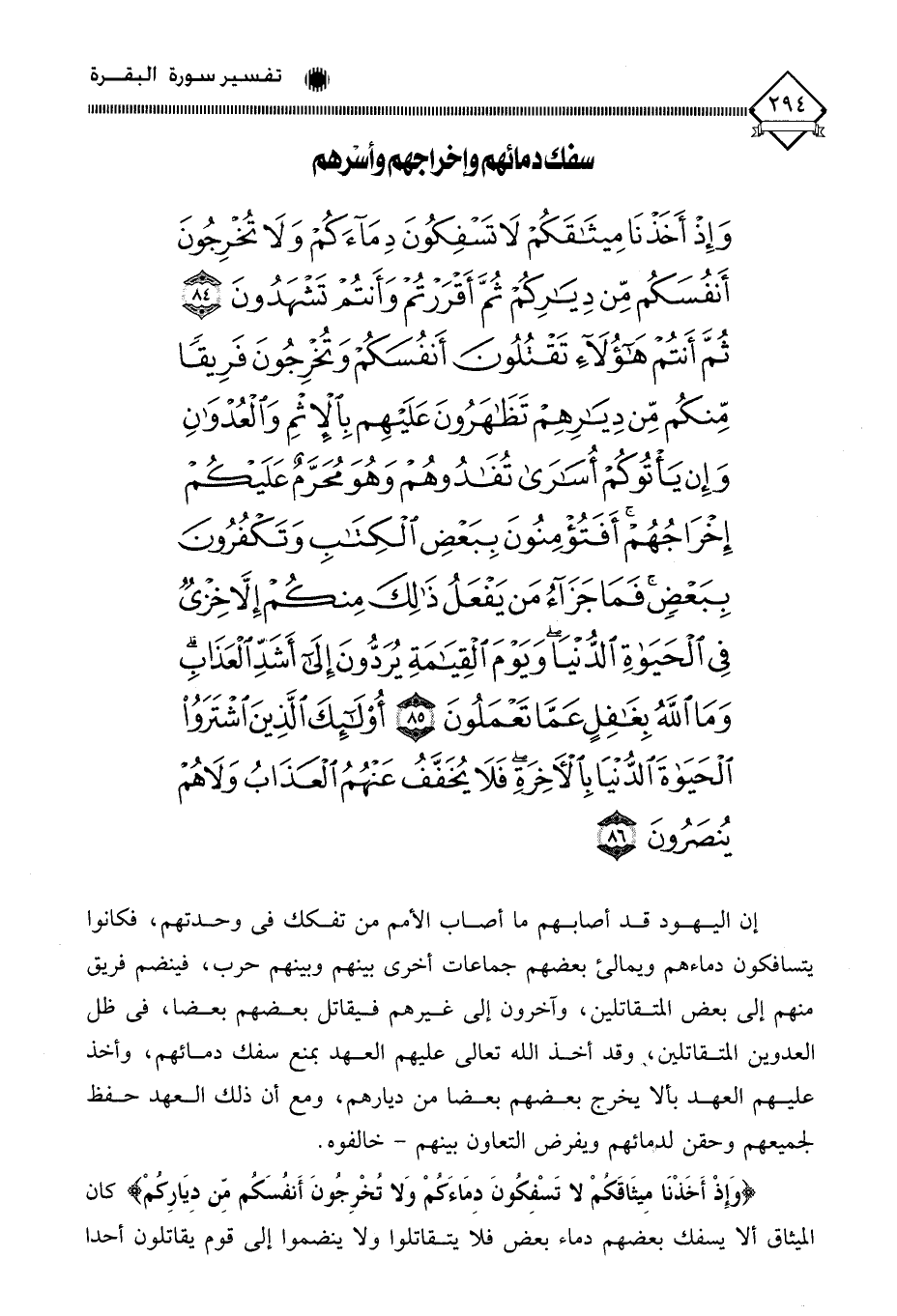 (وَإِذْ أَخَذْنَا مِيثَاقَكُمْ لَا تَسْفِكُونَ دِمَاءَكُمْ وَلَا تُخْرِجُونَ أَنْفُسَكُمْ مِنْ دِيَارِكُمْ ثُمَّ أَقْرَرْتُمْ وَأَنْتُمْ تَشْهَدُونَ (84) ثُمَّ أَنْتُمْ هَؤُلَاءِ تَقْتُلُونَ أَنْفُسَكُمْ وَتُخْرِجُونَ فَرِيقًا مِنْكُمْ مِنْ دِيَارِهِمْ تَظَاهَرُونَ عَلَيْهِمْ بِالْإِثْمِ وَالْعُدْوَانِ وَإِنْ يَأْتُوكُمْ أُسَارَى تُفَادُوهُمْ وَهُوَ مُحَرَّمٌ عَلَيْكُمْ إِخْرَاجُهُمْ أَفَتُؤْمِنُونَ بِبَعْضِ الْكِتَابِ وَتَكْفُرُونَ بِبَعْضٍ فَمَا جَزَاءُ مَنْ يَفْعَلُ ذَلِكَ مِنْكُمْ إِلَّا خِزْيٌ فِي الْحَيَاةِ الدُّنْيَا وَيَوْمَ الْقِيَامَةِ يُرَدُّونَ إِلَى أَشَدِّ الْعَذَابِ وَمَا اللَّهُ بِغَافِلٍ عَمَّا تَعْمَلُونَ (85) أُولَئِكَ الَّذِينَ اشْتَرَوُا الْحَيَاةَ الدُّنْيَا بِالْآخِرَةِ فَلَا يُخَفَّفُ عَنْهُمُ الْعَذَابُ وَلَا هُمْ يُنْصَرُونَ (86)