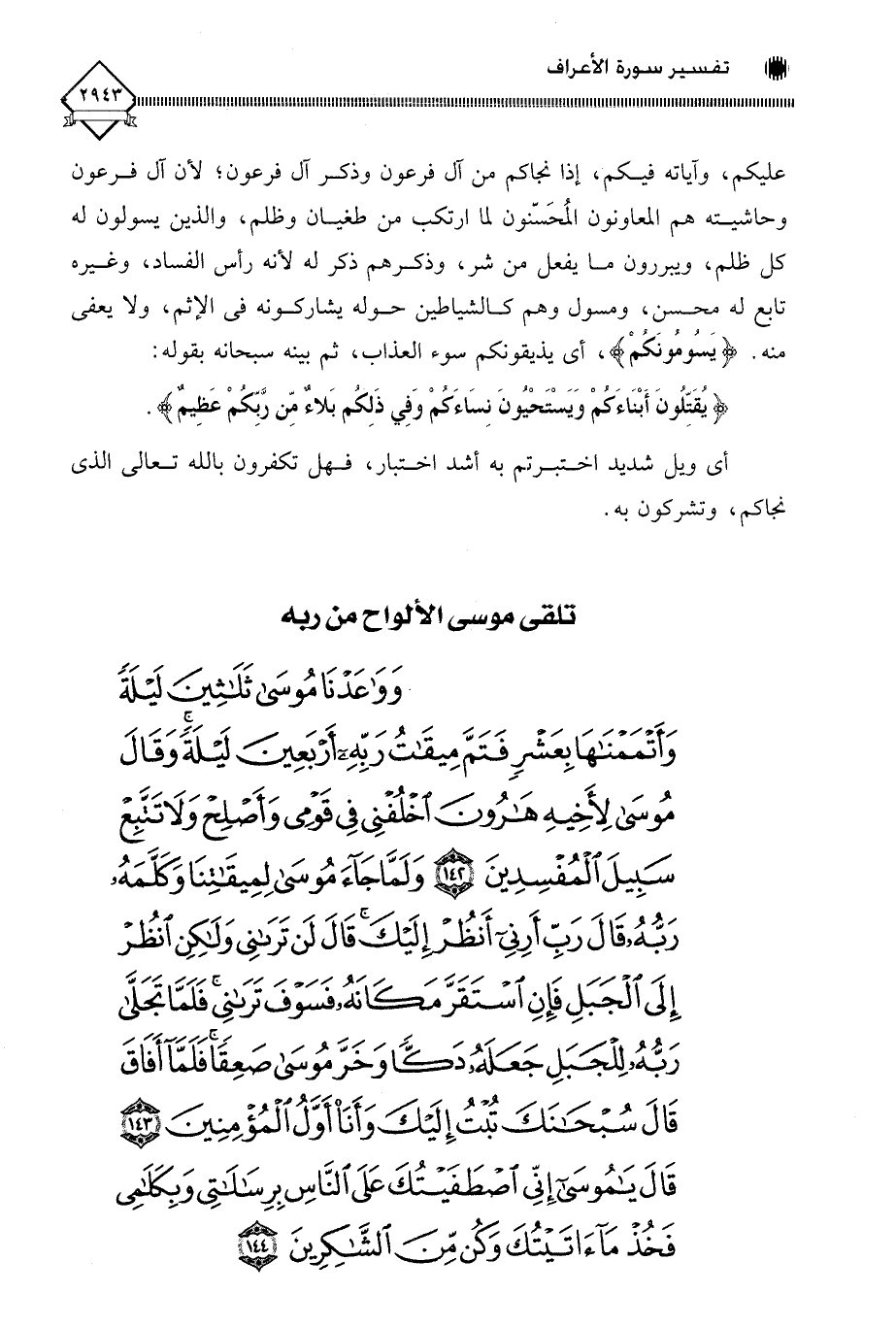 (وَوَاعَدْنَا مُوسَى ثَلَاثِينَ لَيْلَةً وَأَتْمَمْنَاهَا بِعَشْرٍ فَتَمَّ مِيقَاتُ رَبِّهِ أَرْبَعِينَ لَيْلَةً وَقَالَ مُوسَى لِأَخِيهِ هَارُونَ اخْلُفْنِي فِي قَوْمِي وَأَصْلِحْ وَلَا تَتَّبِعْ سَبِيلَ الْمُفْسِدِينَ (142) وَلَمَّا جَاءَ مُوسَى لِمِيقَاتِنَا وَكَلَّمَهُ رَبُّهُ قَالَ رَبِّ أَرِنِي أَنْظُرْ إِلَيْكَ قَالَ لَنْ تَرَانِي وَلَكِنِ انْظُرْ إِلَى الْجَبَلِ فَإِنِ اسْتَقَرَّ مَكَانَهُ فَسَوْفَ تَرَانِي فَلَمَّا تَجَلَّى رَبُّهُ لِلْجَبَلِ جَعَلَهُ دَكًّا وَخَرَّ مُوسَى صَعِقًا فَلَمَّا أَفَاقَ قَالَ سُبْحَانَكَ تُبْتُ إِلَيْكَ وَأَنَا أَوَّلُ الْمُؤْمِنِينَ (143) قَالَ يَا مُوسَى إِنِّي اصْطَفَيْتُكَ عَلَى النَّاسِ بِرِسَالَاتِي وَبِكَلَامِي فَخُذْ مَا آتَيْتُكَ وَكُنْ مِنَ الشَّاكِرِينَ (144)