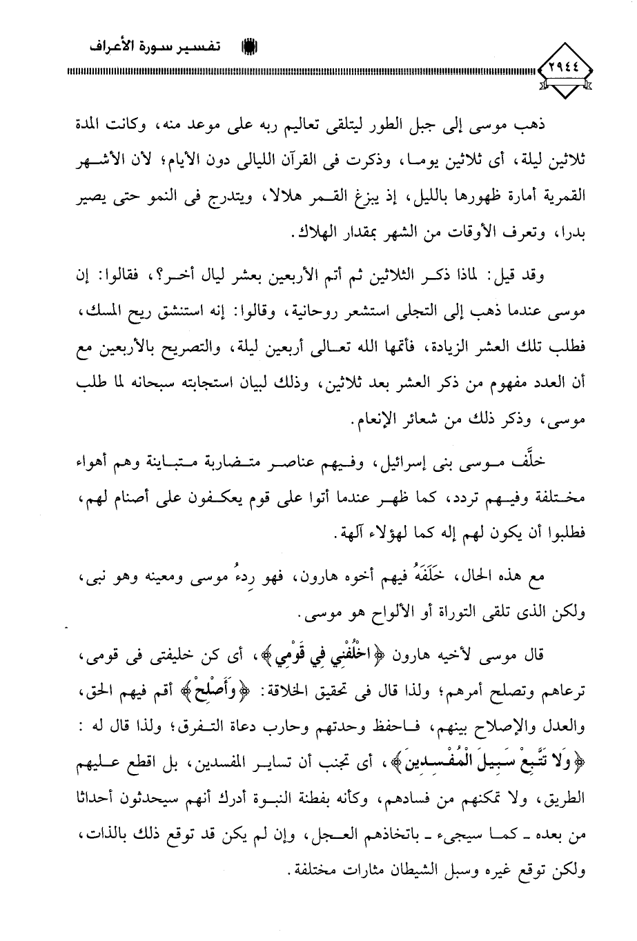 ذهب موسى إلى جبل الطور ليتلقى تعاليم ربه على موعد منه، وكانت المدة ثلاثين ليلة، أي ثلاثين يوما، وذكرت في القرآن الليالي دون الأيام؛ لأن الأشهر القمرية أمارة ظهورها بالليل، إذ يبزغ القمر هلالا، ويتدرج في النمو حتى يصير بدرا، وتعرف الأوقات من الشهر بمقدار الهلاك.