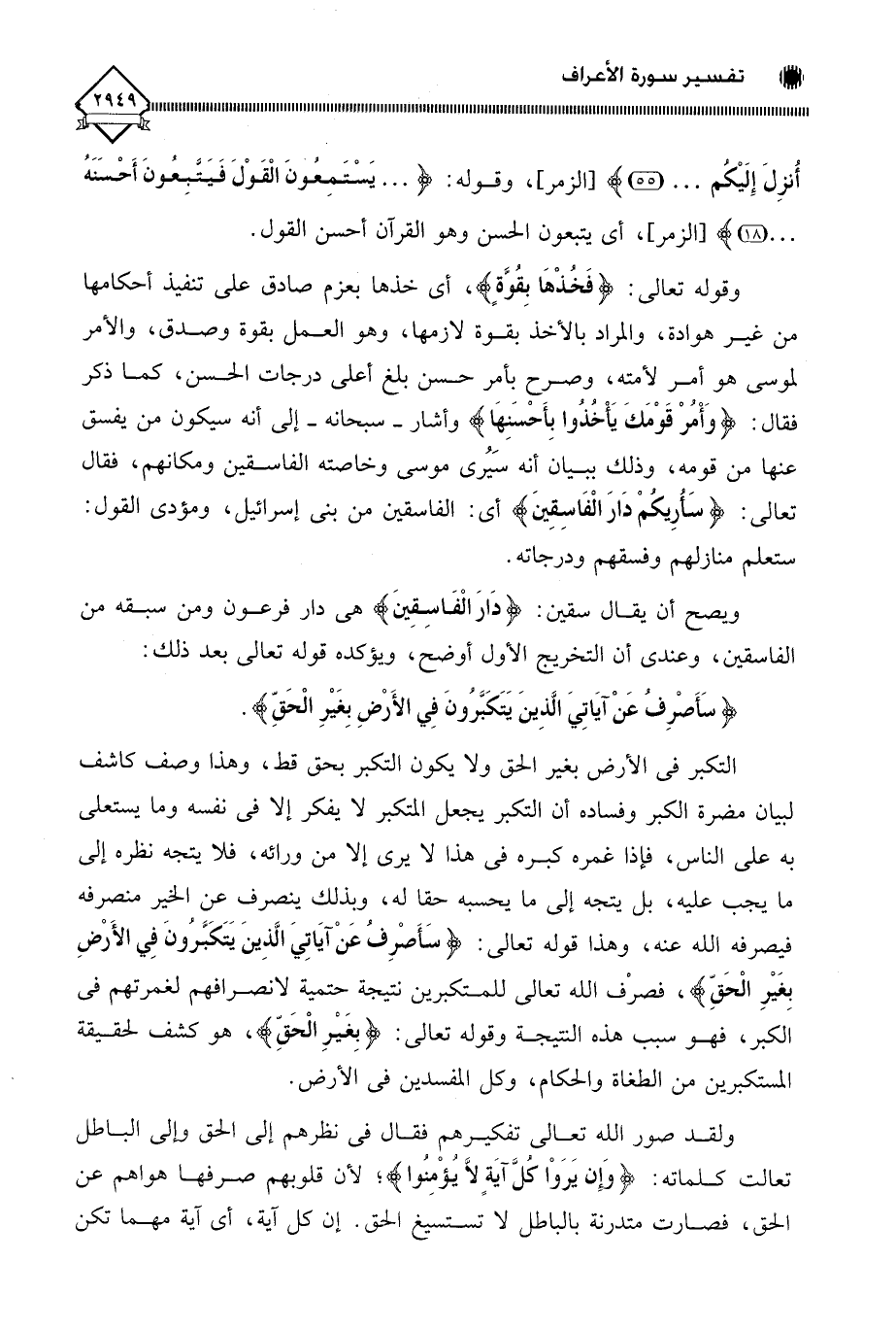التكبر في الأرض بغير الحق ولا يكون التكبر بحق قط، وهذا وصف كاشف لبيان مضرة الكبر وفساده أن التكبر يجعل التكبر لَا يفكر إلا في نفسه وما يستعلى به على الناس، فإذا غمره كبره في هذا لَا يرى إلا من ورائه، فلا يتجه نظره إلى ما يجب عليه، بل يتجه إلى ما يحسبه حقا له، وبذلك ينصرف عن الخير منصرفه فيصرفه الله عنه، وهذا قوله تعالى: (سَأَصْرِفُ عَنْ آيَاتِيَ الَّذِينَ يَتَكَبَّرُونَ فِي الأَرْضِ بِغَيْرِ الْحَقِّ)، فصرْف الله تعالى للمتكبرين نضيجة حتمية لانصرافهم لغمرتهم في الكبر، فهو سبب هذه النتيجة وقوله تعالى: (بِغَيْرِ الْحَقِّ)، هو كشف لحقيقة المستكبرين من الطغاة والحكام، وكل المفسدين في الأرض.