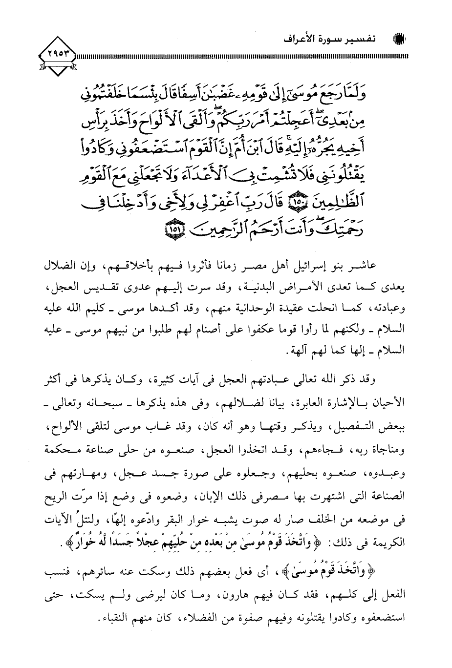 وَلَمَّا رَجَعَ مُوسَى إِلَى قَوْمِهِ غَضْبَانَ أَسِفًا قَالَ بِئْسَمَا خَلَفْتُمُونِي مِنْ بَعْدِي أَعَجِلْتُمْ أَمْرَ رَبِّكُمْ وَأَلْقَى الْأَلْوَاحَ وَأَخَذَ بِرَأْسِ أَخِيهِ يَجُرُّهُ إِلَيْهِ قَالَ ابْنَ أُمَّ إِنَّ الْقَوْمَ اسْتَضْعَفُونِي وَكَادُوا يَقْتُلُونَنِي فَلَا تُشْمِتْ بِيَ الْأَعْدَاءَ وَلَا تَجْعَلْنِي مَعَ الْقَوْمِ الظَّالِمِينَ (150) قَالَ رَبِّ اغْفِرْ لِي وَلِأَخِي وَأَدْخِلْنَا فِي رَحْمَتِكَ وَأَنْتَ أَرْحَمُ الرَّاحِمِينَ (151)
