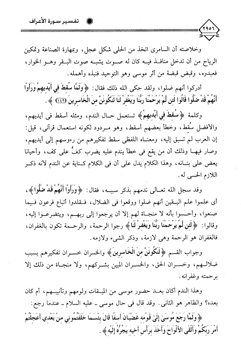 وهذا الندم أكان بعد حضور موسى من الميقات ولومهم وتأنيبهم، أم كان بعده؛ والظاهر هو الثاني. وقد قال في حال موسى - عليه السلام - عندما رجع: (وَلَمَّا رَجَعَ مُوسَى إِلَى قَوْمِهِ غَضْبَانَ أَسِفًا قَالَ بِئْسَمَا خَلَفْتُمُونِي مِنْ بَعْدِي أَعَجِلْتُمْ أَمْرَ رَبِّكُمْ وَأَلْقَى الْأَلْوَاحَ وَأَخَذَ بِرَأْسِ أَخِيهِ يَجُرُّهُ إِلَيْهِ ... (150)