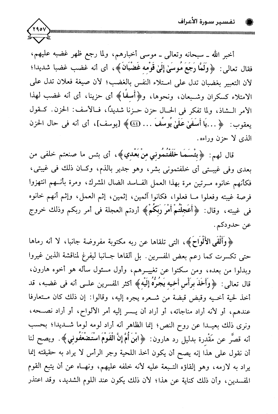 (وَأَلْقَى الأَلْوَاحَ)، التي تلقاها عن ربه مكتوبة مفروضة جانبا، لَا أنه رماها حتى تكسرت كما زعم بعض المفسرين. بل ألقاها جانبا ليفرغ لمناقشة الذين غيروا وبدلوا من بعده، ومن سكتوا عن تغييرهم، وأول مسئول سأله هو أخوه هارون، قال تعالى: (وَأَخَذَ بِرَأْسِ أَخِيهِ يَجرُّهُ إِلَيْهِ) أكثر المفسرين على أنه في غضبه، قد أخذ لحية أخيه وقبض قبضة من شعره يجره إليه، وقالوا: إن ذلك كان متعارفا عندهم، أو لأنه أراد مناجاته، أو أراد أن يسر إليه أمر الألواح، أو أراد نصحه، ونرى ذلك بعيدا عن روح النص، إنما الظاهر أنه أراد لومه لوما شديدا؛ بحسب أنه قصَّر عن مَقْدِرة بدليل رد هارون: (ابْنَ أُمَّ إِنَّ الْقَوْمَ اسْتَضْعَفُونِي). ويصح لنا أن نقول على هذا إنه يصح أن يكون أخذ اللحية وجر الرأس لَا يراد به حقيقته إنما يراد به لازمه، وهو إلقاؤه التبعة عليه لأنه خلفه عليهم، ونهاه عن أن يتبع القوم المفسدين، وأن ذلك كناية عن هذا، لأن ذلك يكون عند اللوم الشديد، وقد اعتذر