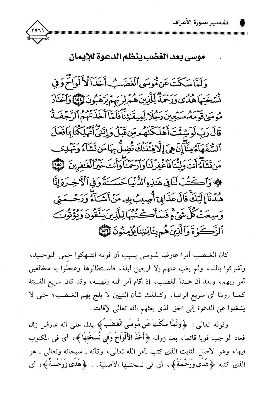 (وَلَمَّا سَكَتَ عَنْ مُوسَى الْغَضَبُ أَخَذَ الْأَلْوَاحَ وَفِي نُسْخَتِهَا هُدًى وَرَحْمَةٌ لِلَّذِينَ هُمْ لِرَبِّهِمْ يَرْهَبُونَ (154) وَاخْتَارَ مُوسَى قَوْمَهُ سَبْعِينَ رَجُلًا لِمِيقَاتِنَا فَلَمَّا أَخَذَتْهُمُ الرَّجْفَةُ قَالَ رَبِّ لَوْ شِئْتَ أَهْلَكْتَهُمْ مِنْ قَبْلُ وَإِيَّايَ أَتُهْلِكُنَا بِمَا فَعَلَ السُّفَهَاءُ مِنَّا إِنْ هِيَ إِلَّا فِتْنَتُكَ تُضِلُّ بِهَا مَنْ تَشَاءُ وَتَهْدِي مَنْ تَشَاءُ أَنْتَ وَلِيُّنَا فَاغْفِرْ لَنَا وَارْحَمْنَا وَأَنْتَ خَيْرُ الْغَافِرِينَ (155) وَاكْتُبْ لَنَا فِي هَذِهِ الدُّنْيَا حَسَنَةً وَفِي الْآخِرَةِ إِنَّا هُدْنَا إِلَيْكَ قَالَ عَذَابِي أُصِيبُ بِهِ مَنْ أَشَاءُ وَرَحْمَتِي وَسِعَتْ كُلَّ شَيْءٍ فَسَأَكْتُبُهَا لِلَّذِينَ يَتَّقُونَ وَيُؤْتُونَ الزَّكَاةَ وَالَّذِينَ هُمْ بِآيَاتِنَا يُؤْمِنُونَ (156)