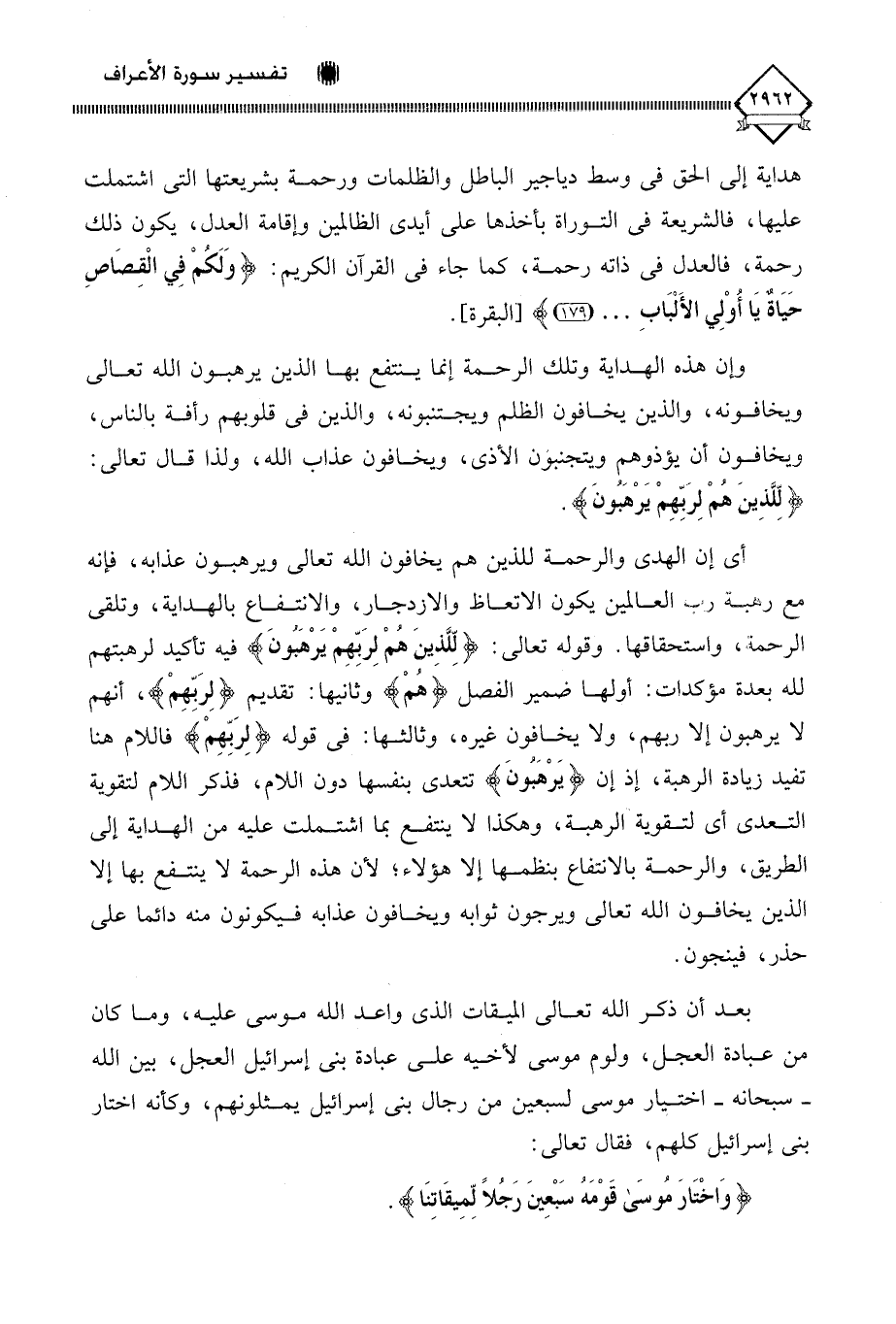 أي إن الهدى والرحمة للذين هم يخافون الله تعالى ويرهبون عذأبه، فإنه مع رهبة رب العالمين يكون الاتعاظ والازدجار، والانتفاع بالهداية، وتلقي الرحمة؛ واستحقاقها. وقوله تعالى: (لِلَّذينَ هُمْ لِرَبِّهِمْ يَرْهَبونَ) فيه تأكيد لرهبتهم لله بعدة مؤكدات: أولها ضمير الفصل (هُمْ) وثانيها: تقديم (لِرَبِّهِمْ)،، أنهم لا يرهبون إلا ربهم، ولا يخافون غيره، وثالثها: في قوله (لِرَبِّهِمْ) فاللام هنا تفيد زيادة الرهبة، إذ إن (يَرْهَبُونَ) تتعدى بنفسها دون اللام، فذكر اللام لتقوية التعدي أي لتقوية الرهبة، وهكذا لَا ينتفع بما اشتملت عليه من الهداية إلى الطريق، والرحمة بالانتفاع بنظمها إلا هؤلاء؛ لأن هذه الرحمة لَا ينتفع بها إلا الذين يخافون الله تعالى ويرجون ثوابه ويخافون عذابه فيكونون منه دائما على حذر، فينجون.