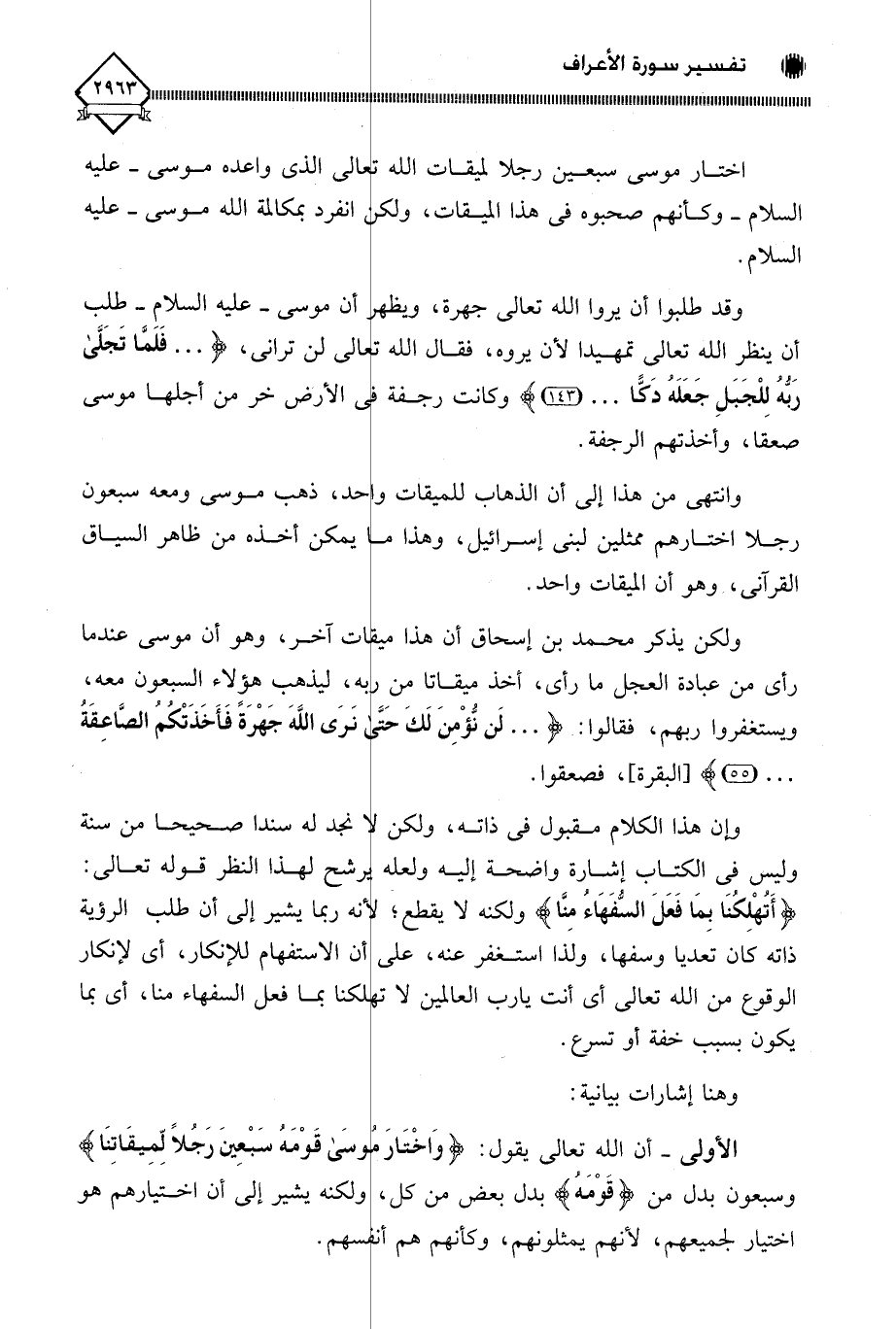 الأولى - أن الله تعالى يقول: (وَاخْتَارَ مُوسَى قَوْمَهُ سَبْعِينَ رَجُلًا لِمِيقَاتِنَا) وسبعون بدل من (قَوْمَهُ) بدل بعض من كل، ولكنه يشير إلى أن اختيارهم هو اختيار لجميعهم، لأنهم يمثلونهم، وكأنهم هم أنفسهم