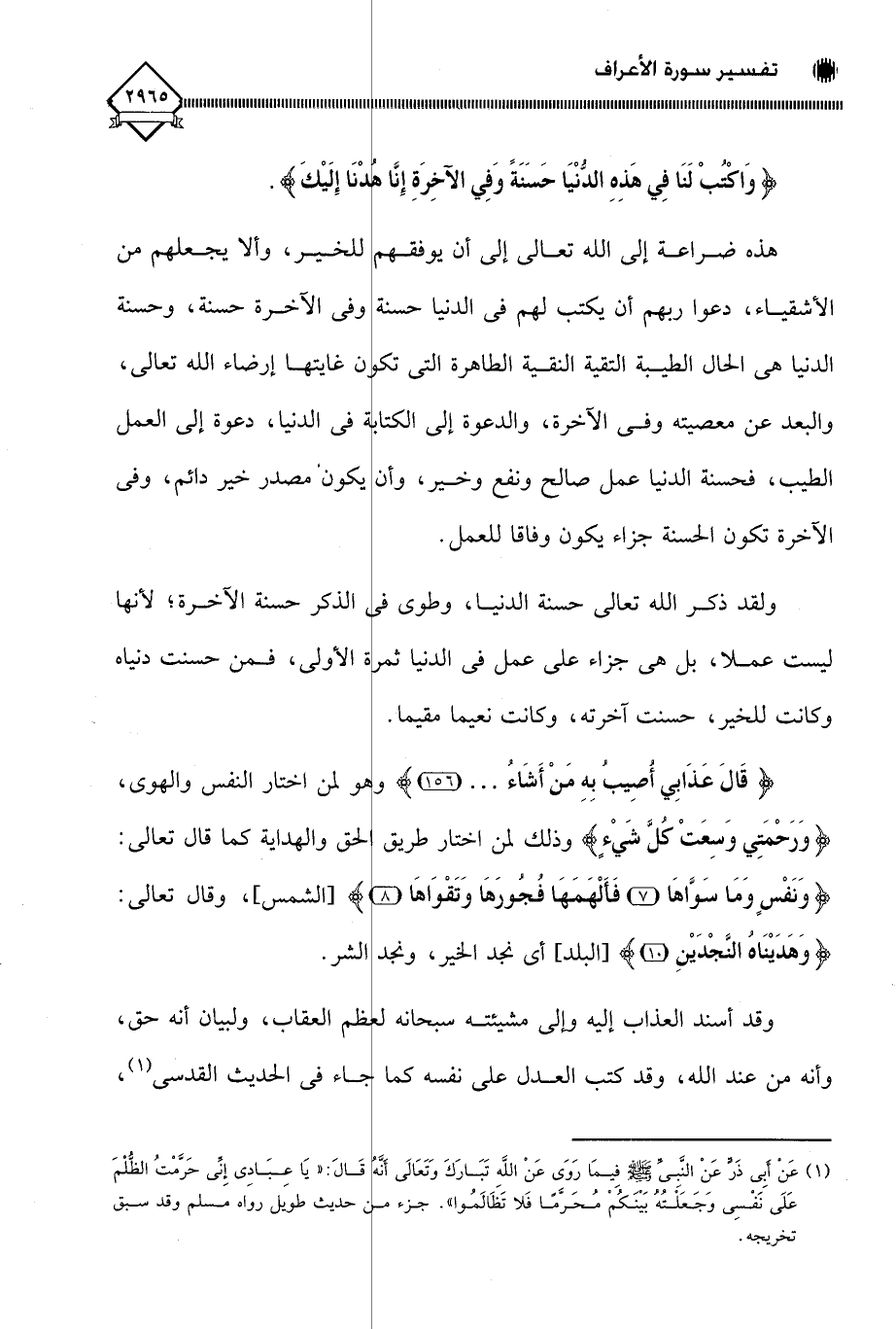 ولقد ذكر الله تعالى حسنة الدنيا، وطوى في الذكر حسنة الآخرة؛ لأنها ليست عملا، بل هي جزاء على عمل في الدنيا ثمرة الأولى، فمن حسنت دنياه وكانت للخير، حسنت آخرته، وكانت نعيما مقيما (قَالَ عَذَابِي أُصِيبُ بِهِ مَنْ أَشَاءُ. . .) وهو لمن اختار النفس والهوى، (وَرَحْمتي وَسِعَتْ كُلَّ شَيْءٍ) وذلك لمن اختار طريق الحق والهداية كما قال تعالى: (وَنَفْسٍ وَمَا سَوَّاهَا (7) فَأَلْهَمَهَا فُجُورَهَا وَتَقْوَاهَا (8).
