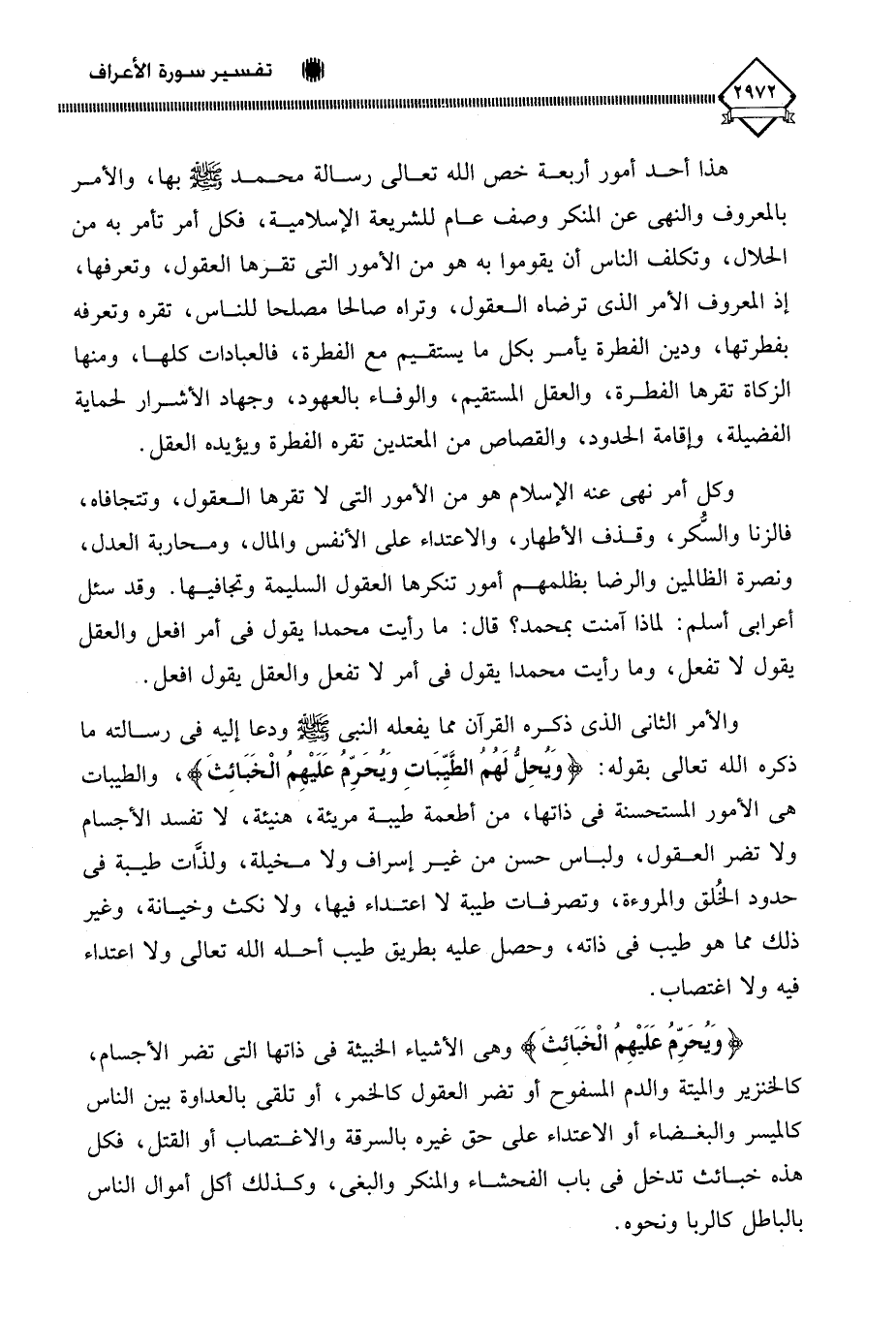 هذا أحد أمور أربعة خص الله تعالى رسالة محمد - صلى الله عليه وسلم - بها، والأمر بالمعروف والنهي عن المنكر وصف عام للشريعة الإسلامية، فكل أمر تأمر به من الحلال، وتكلف الناس أن يقوموا به هو من الأمور التي تقرها العقول، وتعرفها، إذ المعروف الأمر الذي ترضاه العقول، وتراه صالحا مصلحا للناس، تقره وتعرفه بفطرتها، ودين الفطرة يأمر بكل ما يستقيم مع الفطرة، فالعبادات كلها، ومنها الزكاة تقرها الفطرة، والعقل المستقيم، والوفاء بالعهود، وجهاد الأشرار لحماية الفضيلة، وإقامة الحدود، والقصاص من المعتدين تقره الفطرة ويؤيده العقل.