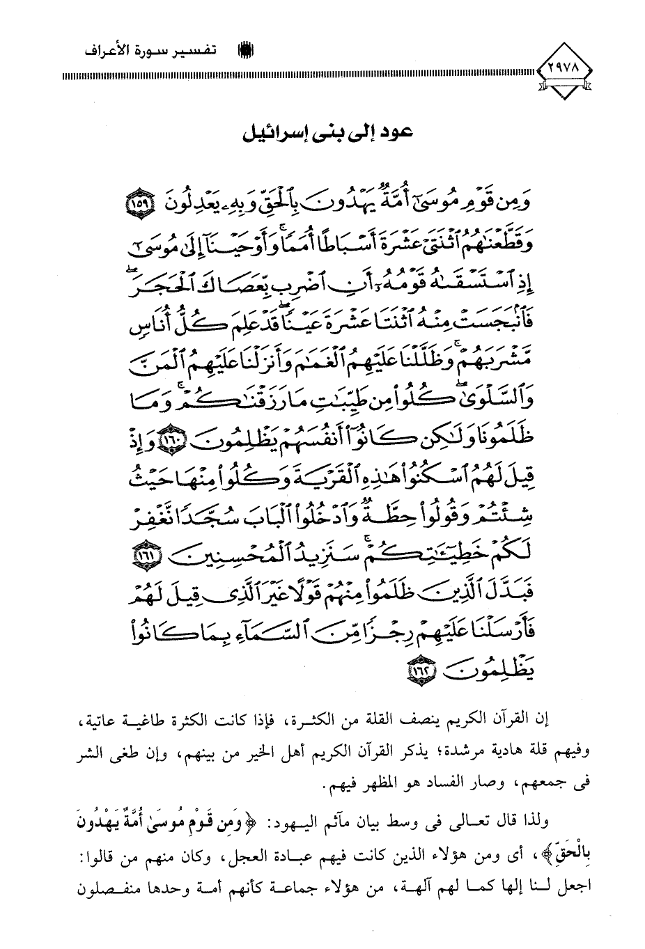 (وَمِنْ قَوْمِ مُوسَى أُمَّةٌ يَهْدُونَ بِالْحَقِّ وَبِهِ يَعْدِلُونَ (159) وَقَطَّعْنَاهُمُ اثْنَتَيْ عَشْرَةَ أَسْبَاطًا أُمَمًا وَأَوْحَيْنَا إِلَى مُوسَى إِذِ اسْتَسْقَاهُ قَوْمُهُ أَنِ اضْرِبْ بِعَصَاكَ الْحَجَرَ فَانْبَجَسَتْ مِنْهُ اثْنَتَا عَشْرَةَ عَيْنًا قَدْ عَلِمَ كُلُّ أُنَاسٍ مَشْرَبَهُمْ وَظَلَّلْنَا عَلَيْهِمُ الْغَمَامَ وَأَنْزَلْنَا عَلَيْهِمُ الْمَنَّ وَالسَّلْوَى كُلُوا مِنْ طَيِّبَاتِ مَا رَزَقْنَاكُمْ وَمَا ظَلَمُونَا وَلَكِنْ كَانُوا أَنْفُسَهُمْ يَظْلِمُونَ (160) وَإِذْ قِيلَ لَهُمُ اسْكُنُوا هَذِهِ الْقَرْيَةَ وَكُلُوا مِنْهَا حَيْثُ شِئْتُمْ وَقُولُوا حِطَّةٌ وَادْخُلُوا الْبَابَ سُجَّدًا نَغْفِرْ لَكُمْ خَطِيئَاتِكُمْ سَنَزِيدُ الْمُحْسِنِينَ (161) فَبَدَّلَ الَّذِينَ ظَلَمُوا مِنْهُمْ قَوْلًا غَيْرَ الَّذِي قِيلَ لَهُمْ فَأَرْسَلْنَا عَلَيْهِمْ رِجْزًا مِنَ السَّمَاءِ بِمَا كَانُوا يَظْلِمُونَ (162)
