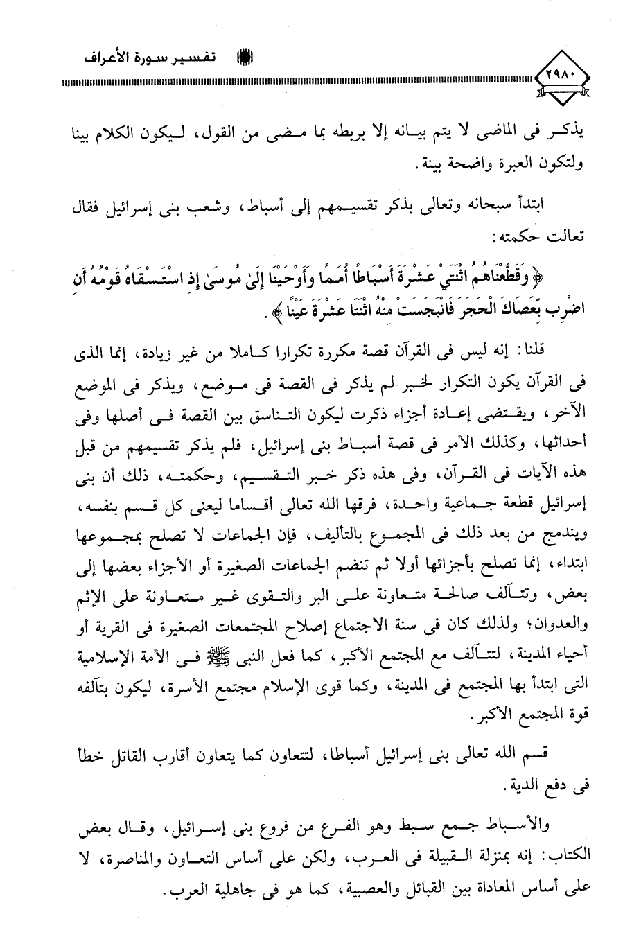 قلنا: إنه ليس في القرآن قصة مكررة تكرارا كاملا من غير زيادة، إنما الذي في القرآن يكون التكرار لخبر لم يذكر في القصة في موضع، وبذكر في الموضع الآخر، ويقتضي إعادة أجزاء ذكرت ليكون التناسق بين القصة في أصلها وفي أحداثها، وكذلك الأمر في قصة أسباط بني إسرائيل، فلم يذكر تقسيمهم من قبل هذه الآيات في القرآن، وفي هذه ذكر خبر التقسيم، وحكمته، ذلك أن بني إسرائيل قطعة جماعية واحدة، فرقها الله تعالى أقساما ليعنى كل قسم بنفسه، ويندمج من بعد ذلك في المجموع بالتأليف، فإن الجماعات لَا تصلح بمجموعها ابتداء، إنما تصلح بأجزائها أولا ثم تنضم الجماعات الصغيرة أو الأجزاء بعضها إلى بعض، وتتآلف صالحة متعاونة على البر والتقوى غير متعاونة على الإثم والعدوان؛ ولذلك كان في سنة الاجتماع إصلاح المجتمعات الصغيرة في القرية أو أحياء المدينة، لتتآلف مع المجتمع الأكبر، كما فعل النبي - صلى الله عليه وسلم - في الأمة الإسلامية التي ابتدأ بها المجتمع في المدينة، وكما قوى الإسلام مجتمع الأسرة، ليكون بتآلفه قوة المجتمع الأكبر.